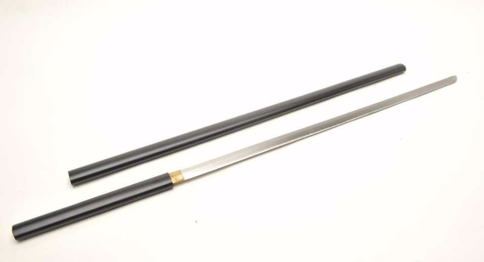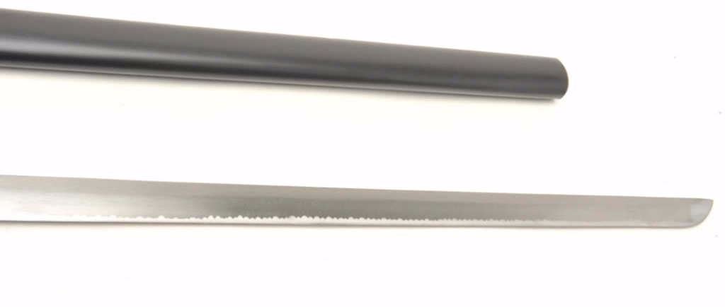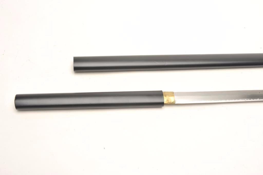 Japanese modern reproduction of a samurai sword, approximately 29.5” blade and in wooden grip and sheath. Est.: $35-$50.