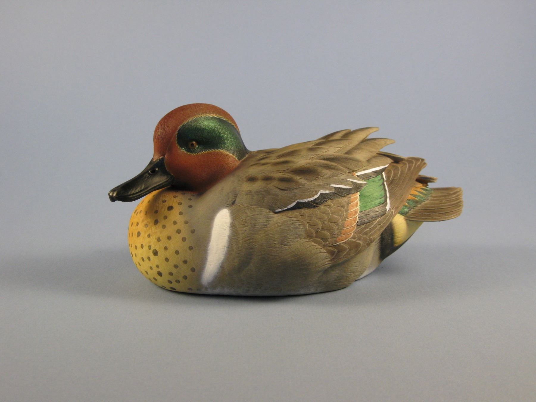 Cast resin decoy from the original wood carving by World Champion waterfowl carver Jude Brunet of Louisiana. Brunet decoys have appeared in the DU event merchandise package for over 20 years. Painted in exacting detail. A Special Artist Edition medallion is inlaid in the felt covered bottom.