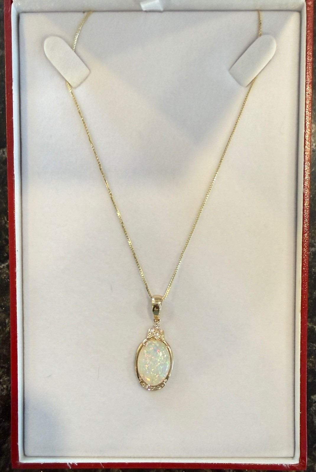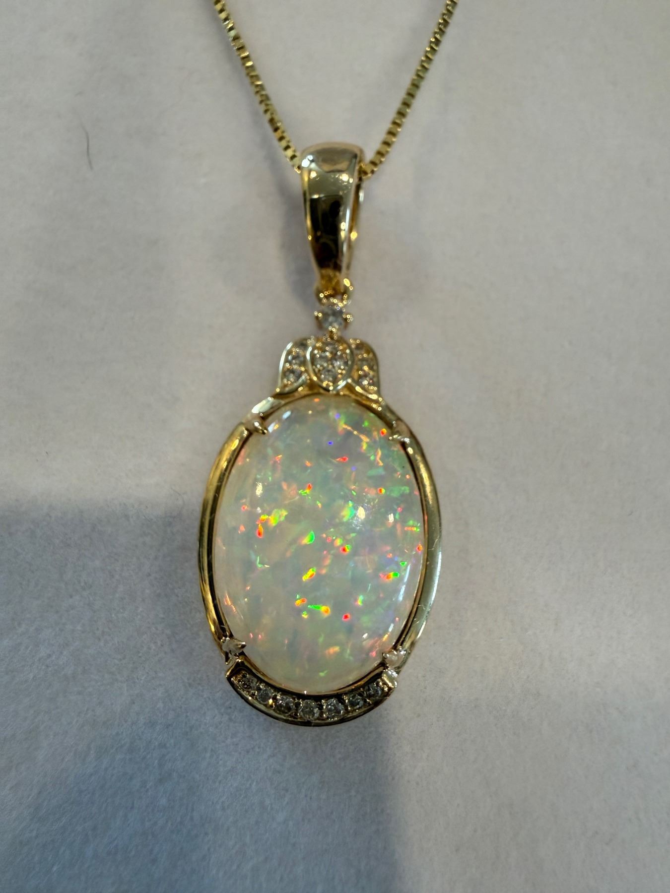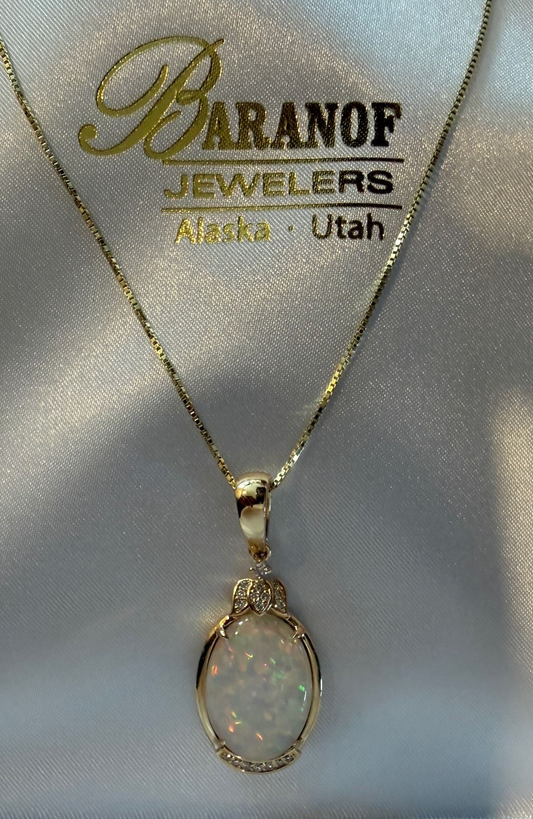 This beautiful Ethiopian Opal Pendant is 5.60 CT with 0.25TCW of Round Diamonds, set in 14K yellow and chain. Baranof Jewelers offers high quality, elegant fashion jewelry for women with locations in Park City, Utah and Sitka, Alaska.