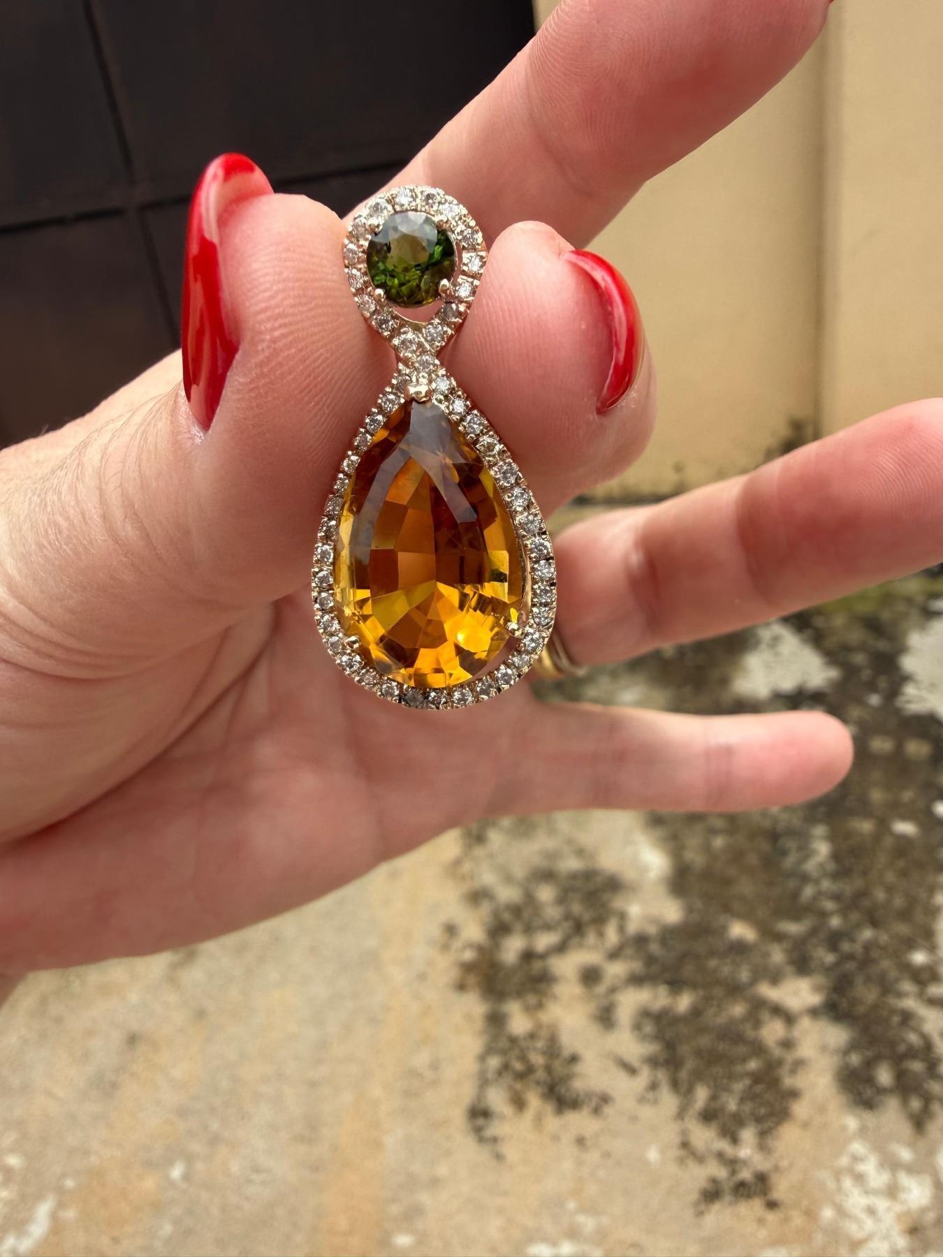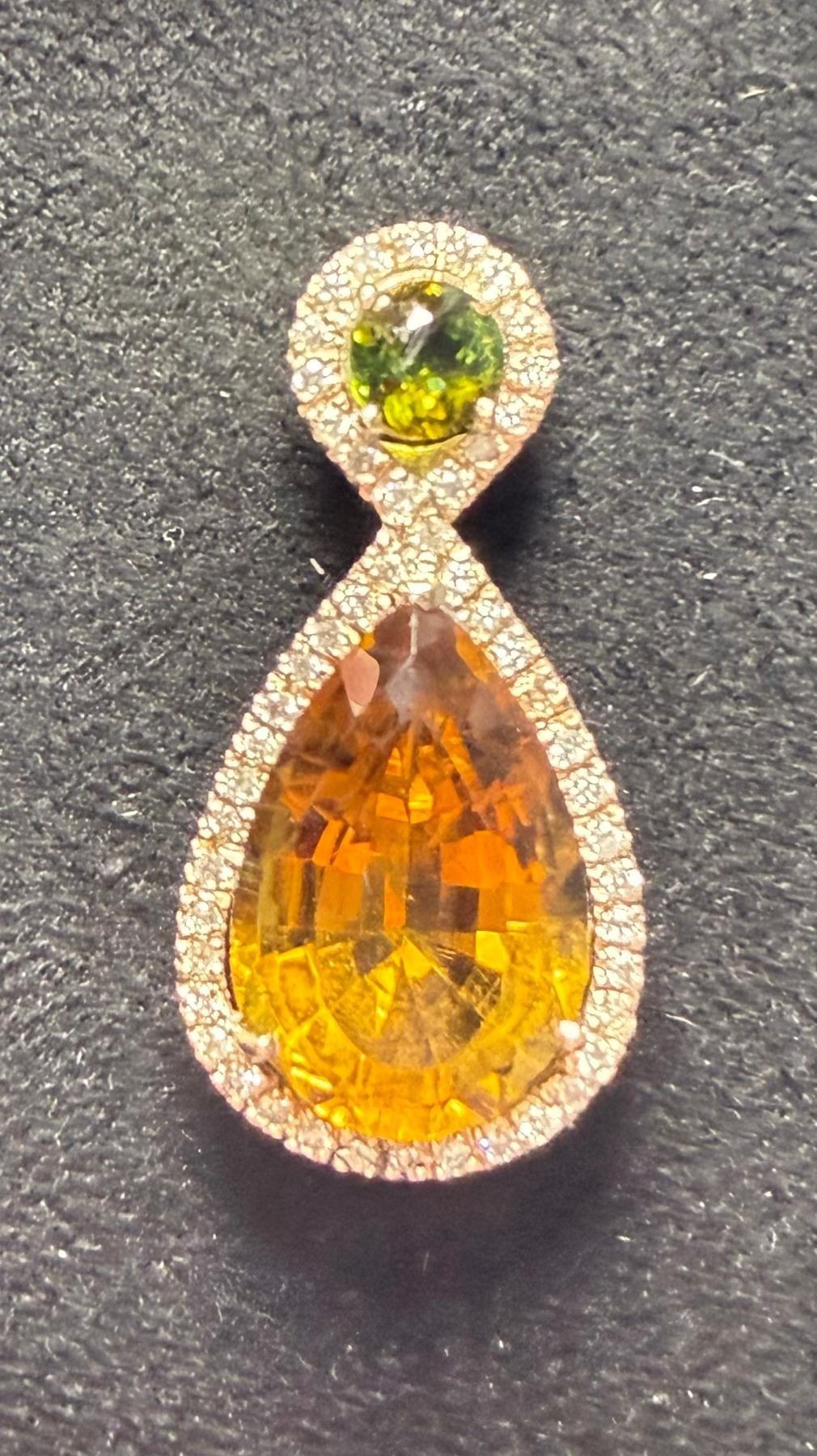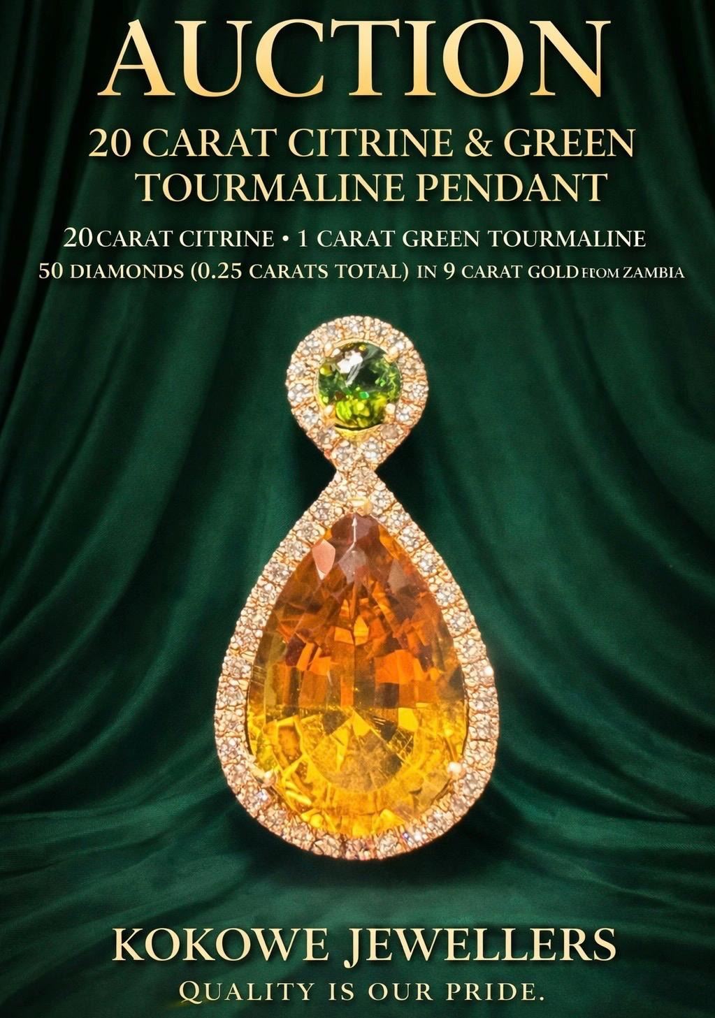 At its centre is a radiant 20-carat honey-coloured teardrop citrine, paired with a vibrant 1-carat green tourmaline and surrounded by 50 sparkling diamonds totaling 0.25 carats. The piece is elegantly set in Zambian 9ct gold, bringing together locally sourced materials in a design that is both timeless and uniquely Zambian.