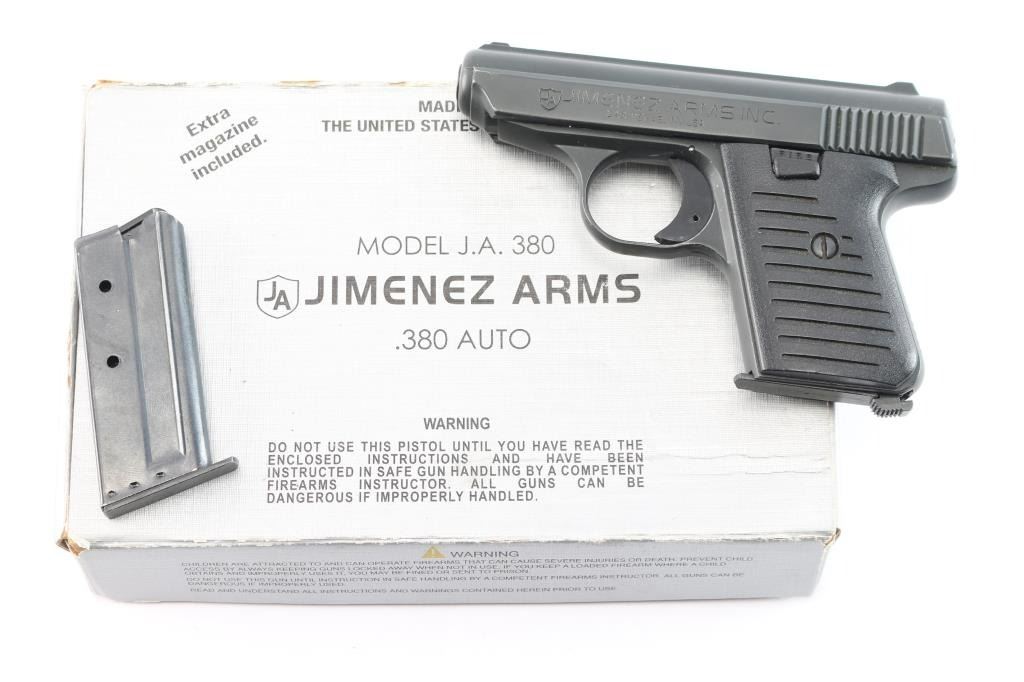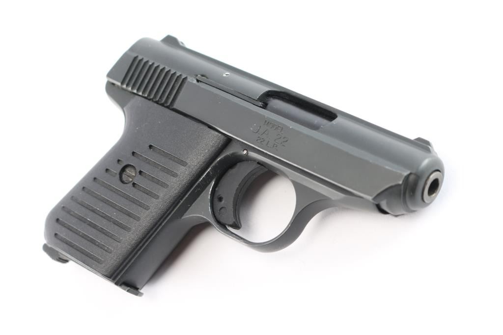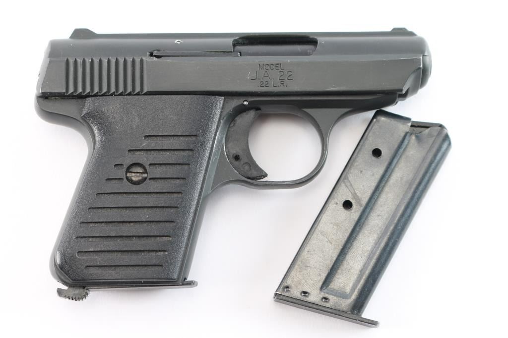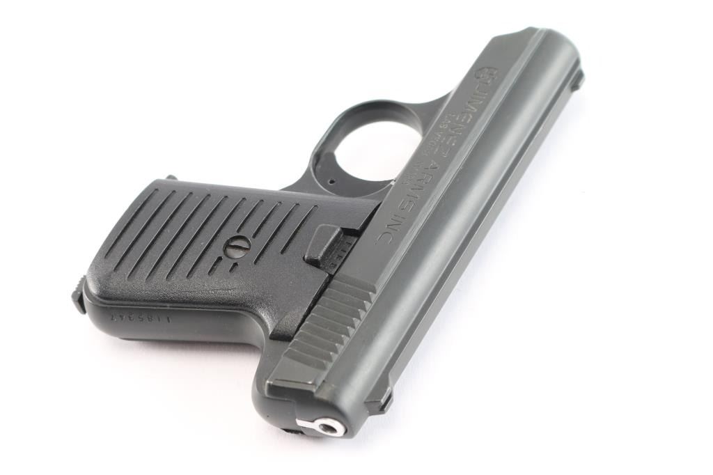 Striker fired semi-automatic pocket pistol chambered in .22 Long Rifle. Features a matte black finish, 2.5" barrel, fixed sights, thumb safety, 6 round magazine, cocked indicator, smooth trigger and two-piece grooved black plastic grips. Includes mismatched factory cardboard box with a spare magazine. Pistol exhibits little to no visible wear. Action is sound, bore is very good/bright and plastic grips are very good.