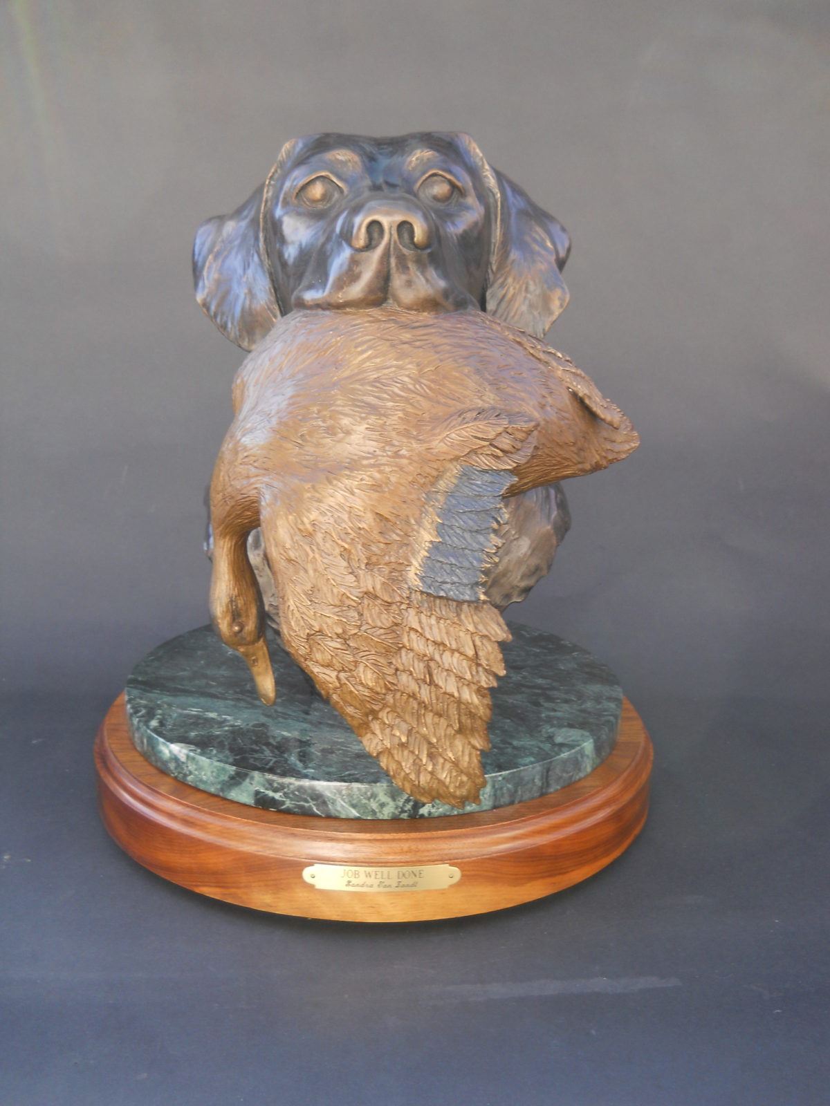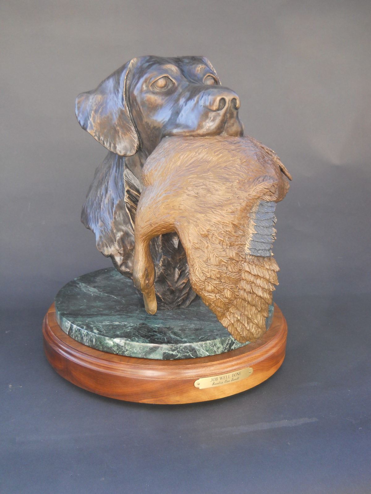 If you’ve ever had a hunting dog then you know how they become a part of your life and are forever loyal. This exquisite bronze evokes that bond and loyalty. World renowned artist Sandra Van Zandt established her reputation with sculptures of hunting dogs, game birds and bald eagles, many of which can be found in cities, museums and both corporate and private art collections throughout the United States. She was recently commissioned to sculpt several historic monuments, one of which was "The Spirit of Naval Aviation," a salute to all naval aviators in the 20th century. This heroic sized sculpture was unveiled at the Smithsonian's Air & Space Museum in Washington, D.C. and permanently enshrined at the entrance of the National Museum of Naval Aviation in Pensacola, Florida. “Job Well Done” is 14” x 16”, mounted on a beautiful rotating base of green marble and wood. It weighs approximately 43 pounds. The sculpture is signed in the bronze by the artist and numbered 4 of 10. We thank Dr. Pat Amoroso for this 100% donation.