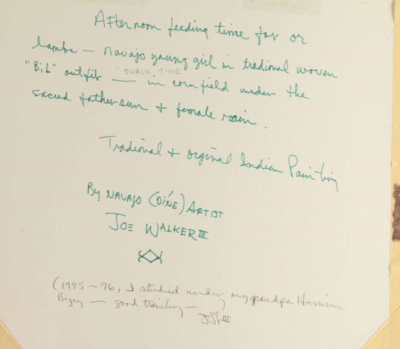 two original pieces with extensive personal notes on back from a respected Navajo artist: "Afternoon Feeding Time for Our Lambs" (or "Snack Time"), 20" x 25" framed. "Two Navajo Boys Out Riding", 30" x 24" framed.