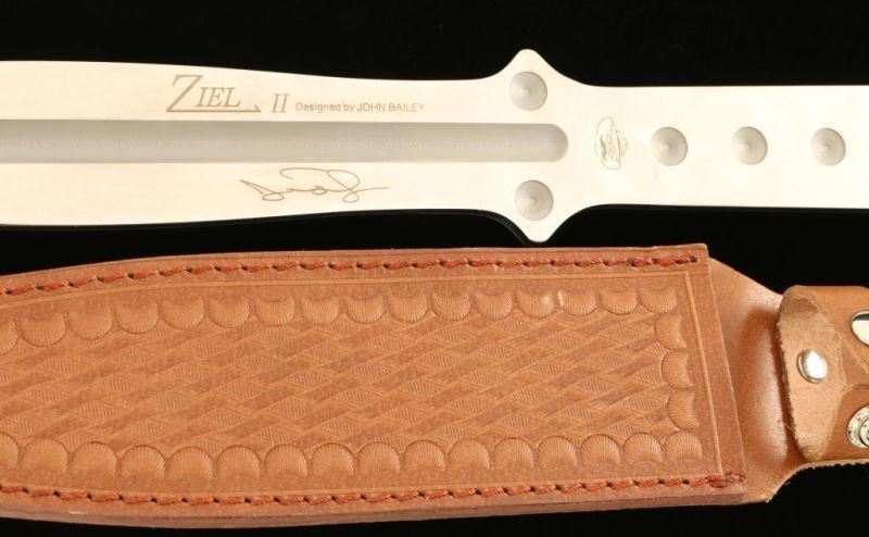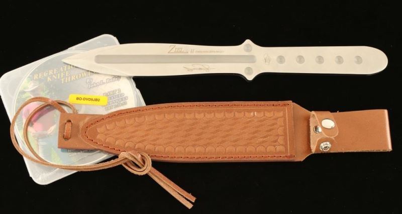 Includes John Bailey recreational Knife Throwing DVD, knife marked 'Ziel #2'. 13" overall with 7 1/2" blade with leather sheath.