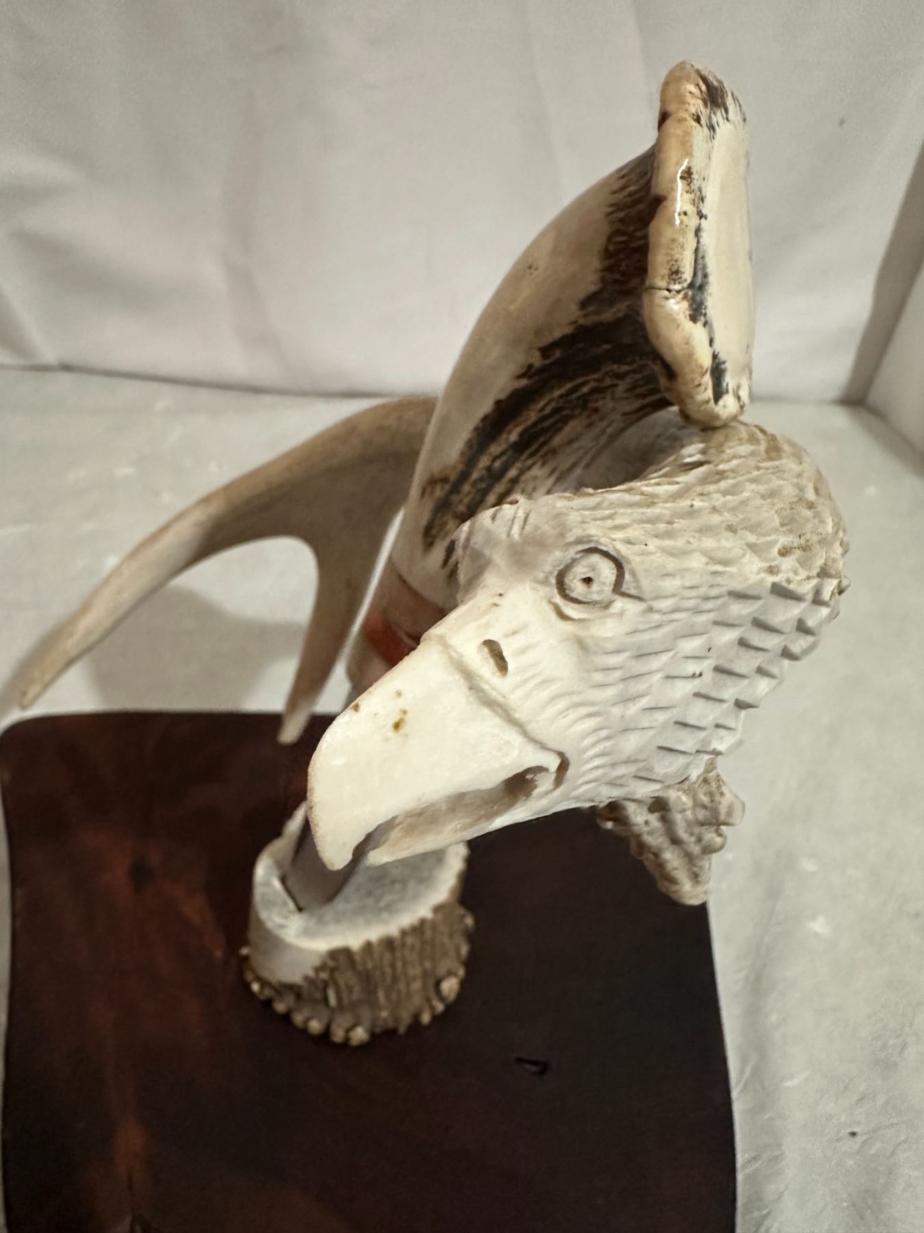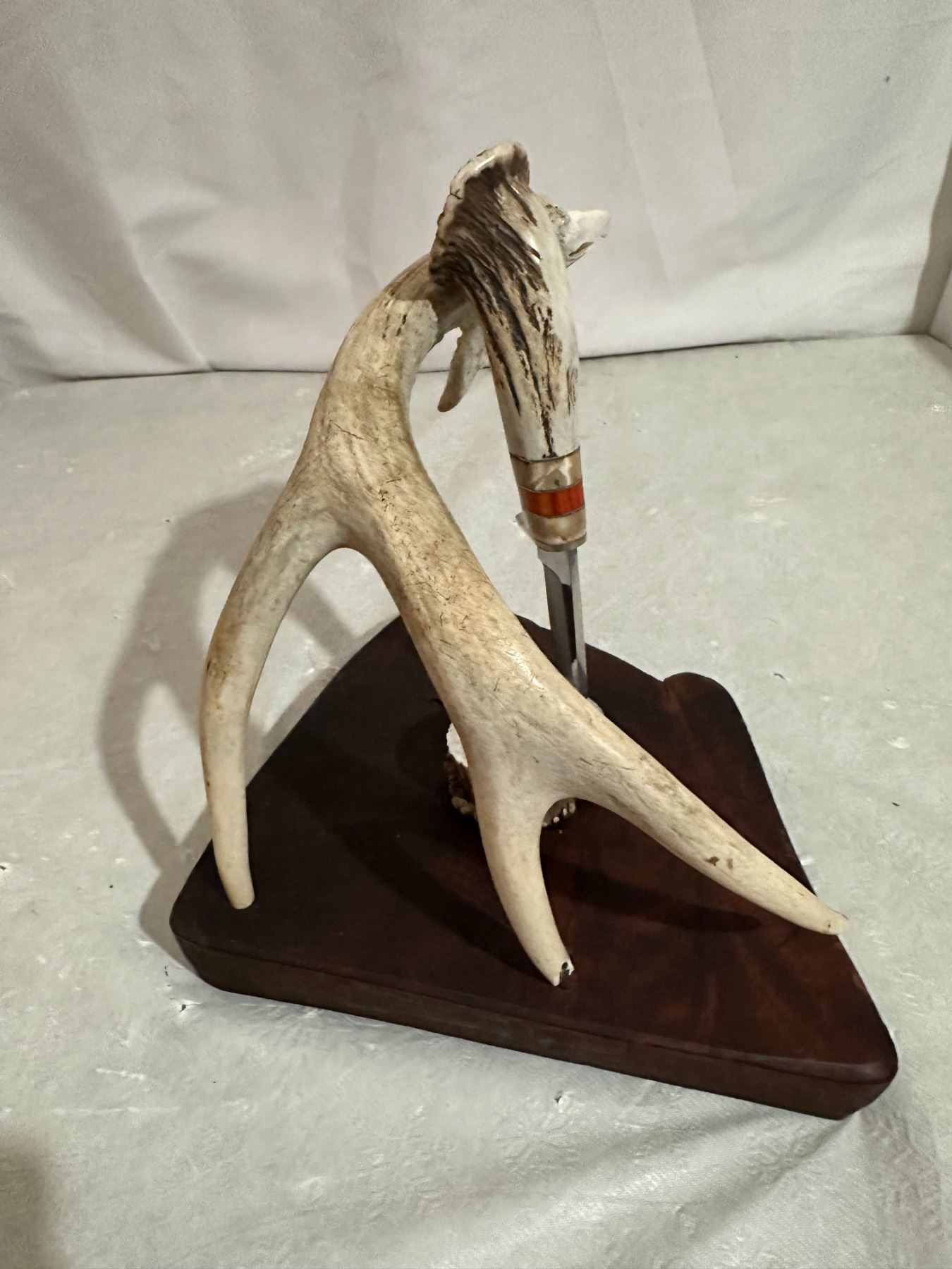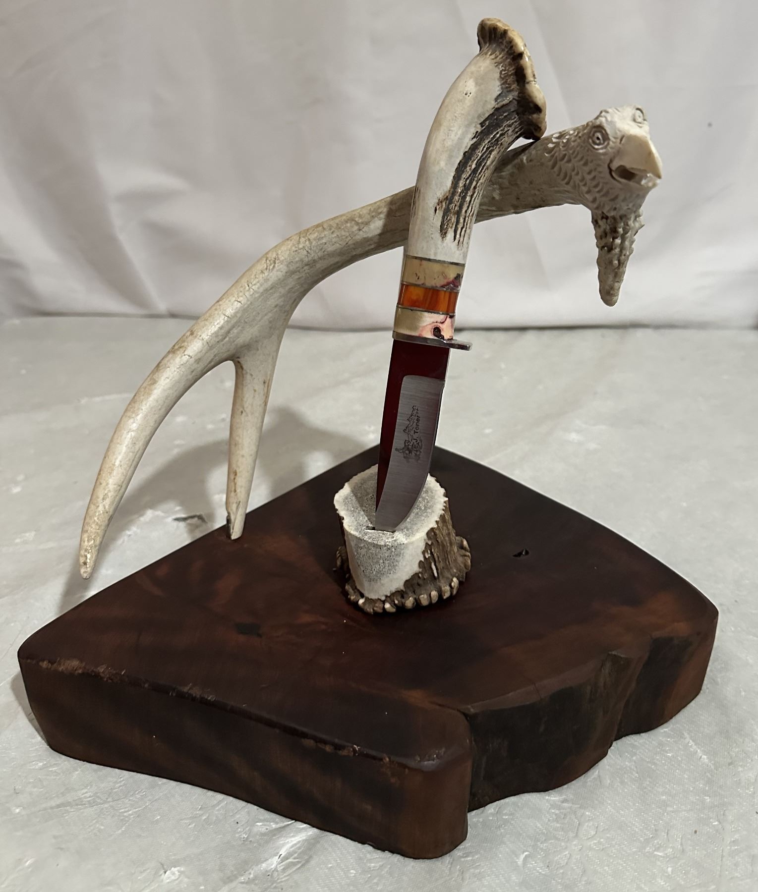 The Knife sits on slab of hardwood, is positioned a top an elk burl and rests on a 3 point mule deer antler. The antler burl has been cared to resemble the head of an eagle, simply amazing the detail in the carved head. .