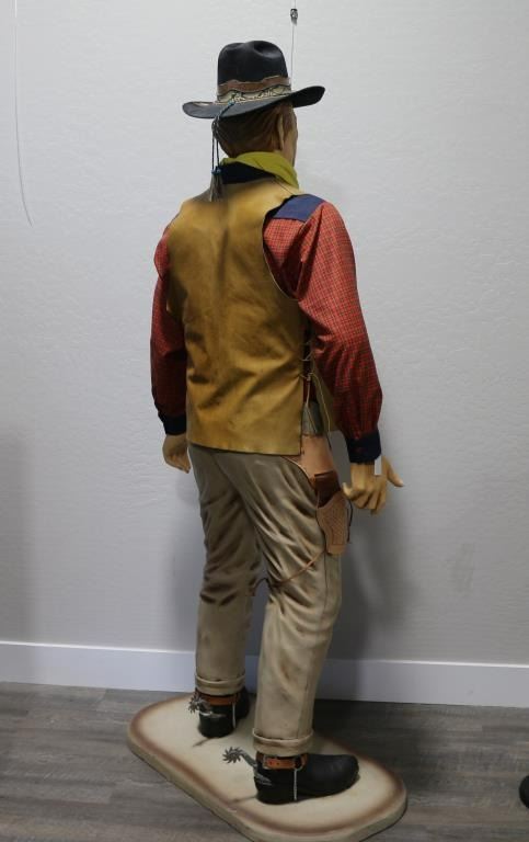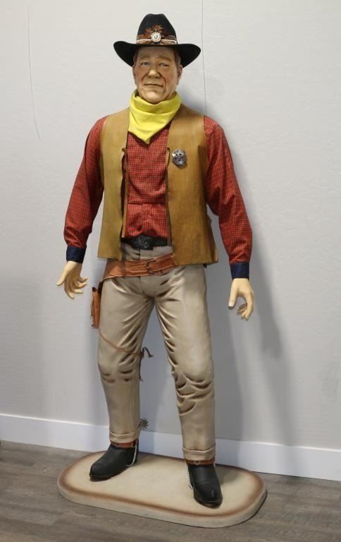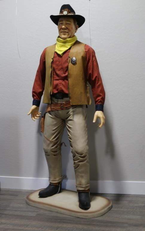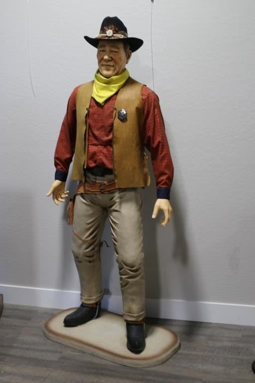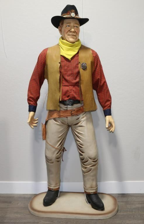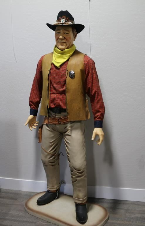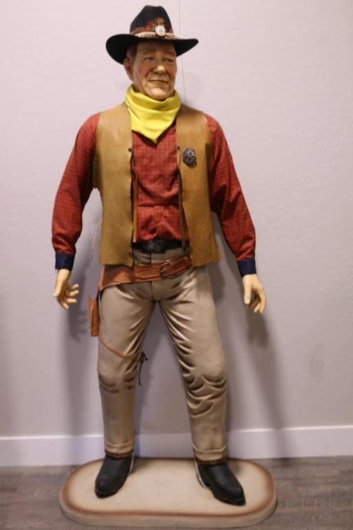 Measures: 78"H x 35"W x 20"D. Features John Wayne wearing a cowboy hat, a plaid shirt, leather vest, yellow scarf, belt with holster and spurs. ***Local Pickup or Buyer Must Arrange Shipping***