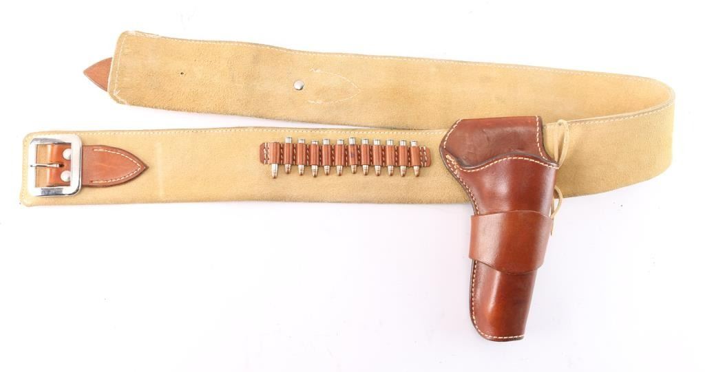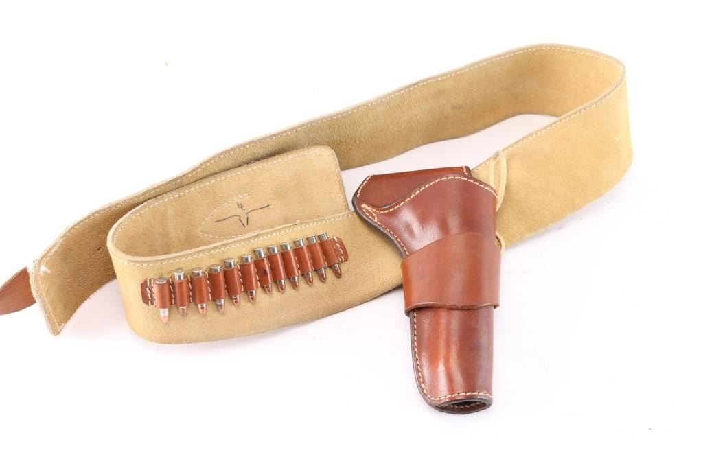 set made for a 22 Scout. Tan suede belt with brown leather holster. 45" end to end.