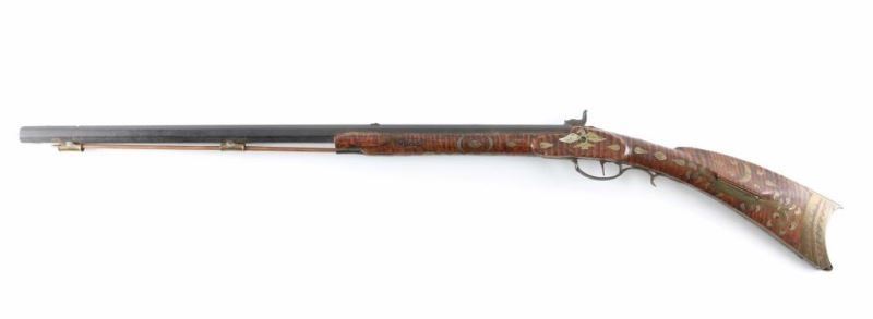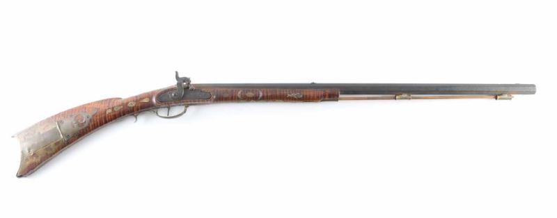 NVSN Single shot black powder rifle features browned metal, half length tiger-stripe wood stock, shallow right handled cheek piece, 31" octagon barrel, blade front & notch rear sight in dovetails, extra empty dovetail behind front sight, ferrules under barrel hold a wood cleaning rod with carved patch slot, brass fittings, semi-crescent buttplate, patch box on right side of butt. Bore is rusty. Metal surfaces are brown color, slightly rough texture, pitted around bolster & nipple. Wood stock is good serviceable condition, scratches & creased, showing shrinkage from metal edges, heavily inlaid with sheet metal shapes that include fish & eagle & moons (one fish missing). No nosecap present, several repaired breaks or cracks observed at front of stock forward of lock. Markings on lock plate are sharp & readable. Condition is NRA Good *** Antique Firearm ***
