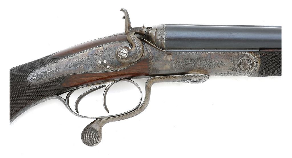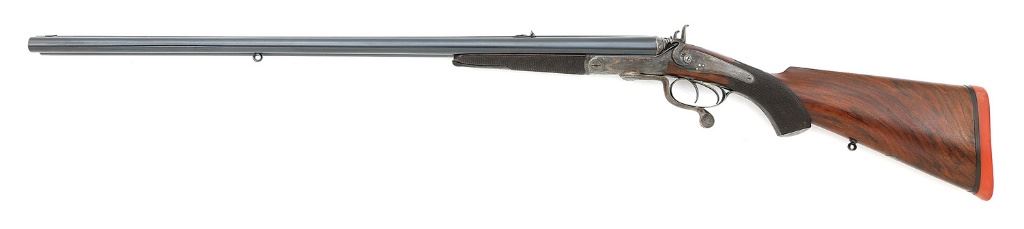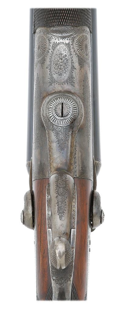 serial #7232, 500 BPE, 28" barrels with bright excellent deeply rifled bores. This rifle features the famous Jones underlever action with back action locks. The barrels show 98% excellent quality later re-blacking, the Cockspur London address and makers marking slightly light but the engraving on the dolls head extension still very prominent. The action and locks show tight English scroll engraving in near full coverage with a small floral bouquet ahead of the underlever pivot. They retain about 97% original color case-hardening, fading in some spots and vibrant in others, with a couple very tiny freckles of oxidation which are unobtrusive. The triggerguard extends to the steel gripcap, the grasping area toned to a pewtery finish, the lightly engraved steel gripcap showing some smoky colors. The checkered pistolgrip English walnut buttstock rates excellent with what appears to be much original varnish, however knowing the British penchant for refinishing arms, and the fact that the metal is slightly proud in spots, this may be a high-quality refinish. The checkering remains sharp with a couple dings or chipped points here and there. The splinter forend is fully checkered and darker and shows a bit more wear, its release lever with some very nice restored blue however. The buttstock shows some very lovely figure and boasts a 14 1/2'' length of pull to the solid red curved pad, with drops of 1 5/8'' and 2 5/8'', the silver monogram plate along the toeline remains un-engraved. The barrels lockup solidly on-face and the non-rebounding back action locks are crisp and mechanically functional. The arm is sighted with a low profile beaded blade front sight with single standing and two folding leaf express rear sights graduated for 100, 200 and 250 yards and the arm has maker swivel-eyes. A very handsome and rugged double rifle that would be suitable for any North American large game for the nostalgic hunter. (3C11739-39) {ANTIQUE} (5000/7000)