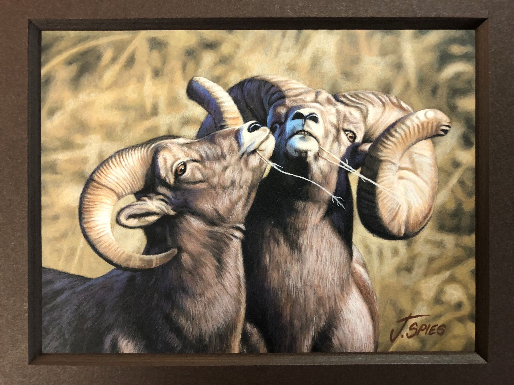 Joshua Spies is internationally known as one of the most gifted and successful wildlife artists of our time. Since graduating from South Dakota State University, this young man has painted professionally for nearly 25 years. Raised in Watertown, South Dakota by a family of avid hunters, Joshua was mentored by Terry Redlin and other well-known South Dakota wildlife painters. Josh has won almost every award possible for a wildlife artist to win, including the prestigious 2008 Federal Duck Stamp Contest. Joshua Spies is an unapologetic big game hunter and conservationist who has travelled the world hunting while studying subject material and wildlife for his spectacular paintings. An addicted sheep hunter, Josh has achieved his Grand Slam while generously donated tens of thousands of dollars to the conservation of North American Wild Sheep and other wildlife. Tonight, Joshua is doing that once again by donating a very special miniature original which just won Joshua the 2018 Miniature National SCI Art Competition! This elegantly framed 5” by 7” acrylic original is of the pending world record Rocky Mt. Bighorn which scores 216 Boone and Crockett. This 9-year-old ram died of natural causes on Wild Horse Island in Flathead Lake in western Montana. The horns of this great ram weigh an incredible 48 pounds and surpass the current world record by a whopping 7 inches!