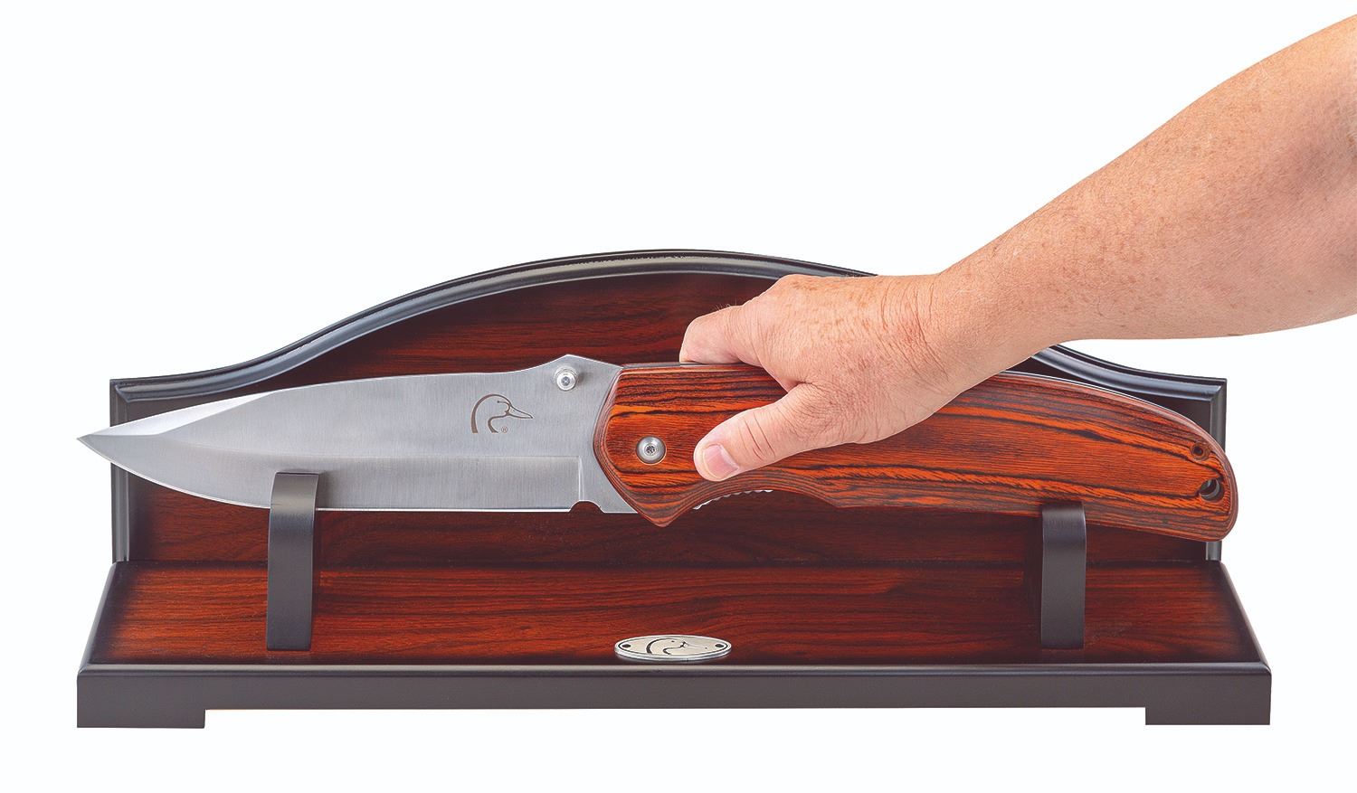 This jumbo folding knife has a pakkawood handle and stainless steel blade etched with the DU logo. It includes a mantle style display stand to hold the 19” knife in open position. A silver DU logo medallion is affixed to the stand.