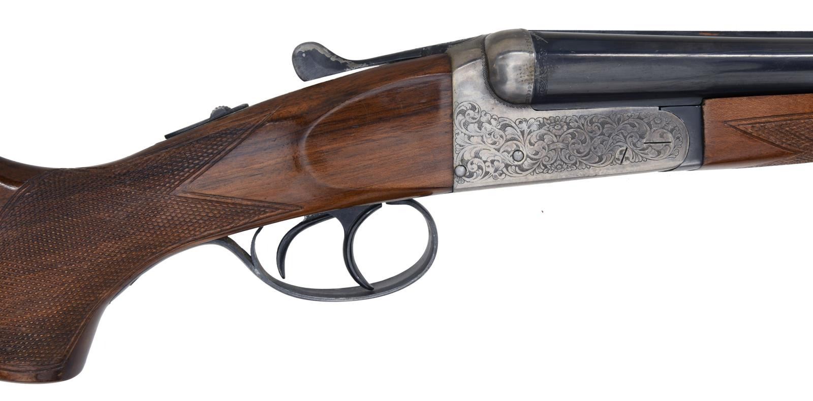 Cal. 20 Ga., 3". S# 335192 (D2 = 1984). Bbls. 24" w/ raised matted rib & brass bead. Full & Mod. fixed chokes. Antique silver finished boxlock action w/ scroll engraving. Dbl. triggers, extractors & safety. Checkered walnut stock set w/ Churchill brown pad. UNATTACHED ACCESSORIES: Kittery Trading Post receipt & photo. CONDITION: good plus reblack finish w/ spots of finish loss, marks & areas of residue buildup. Receiver faded to gray w/ marks & residue buildup on right side interior. Very good wood finish w/ deep handling marks & scratches. Bright shiny bores w/ light fouling near chamber. (23-920/MD). MODERN. $350-500.