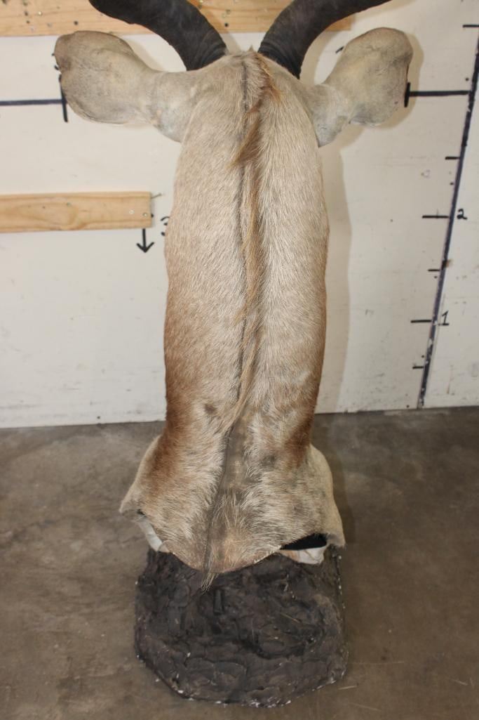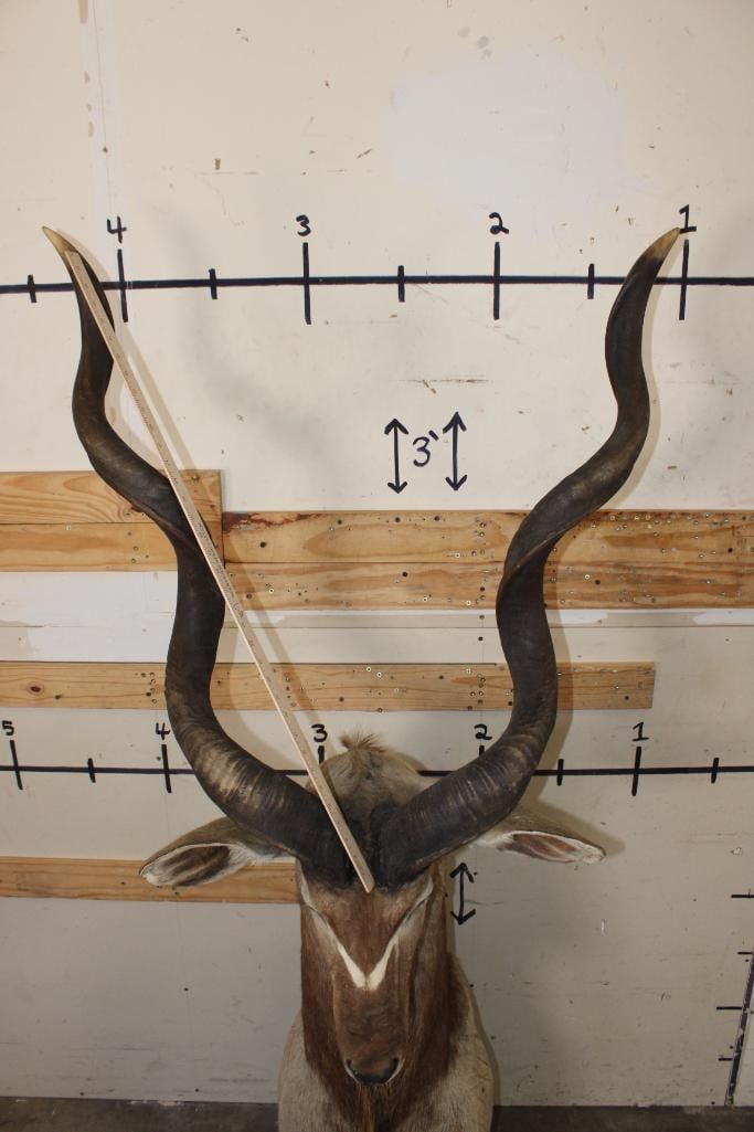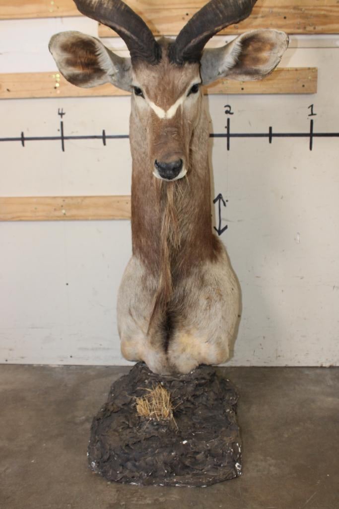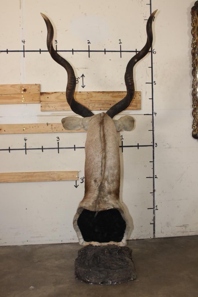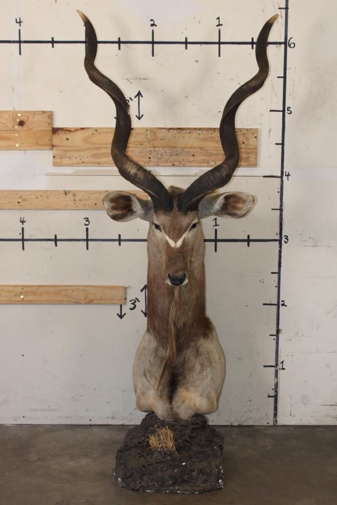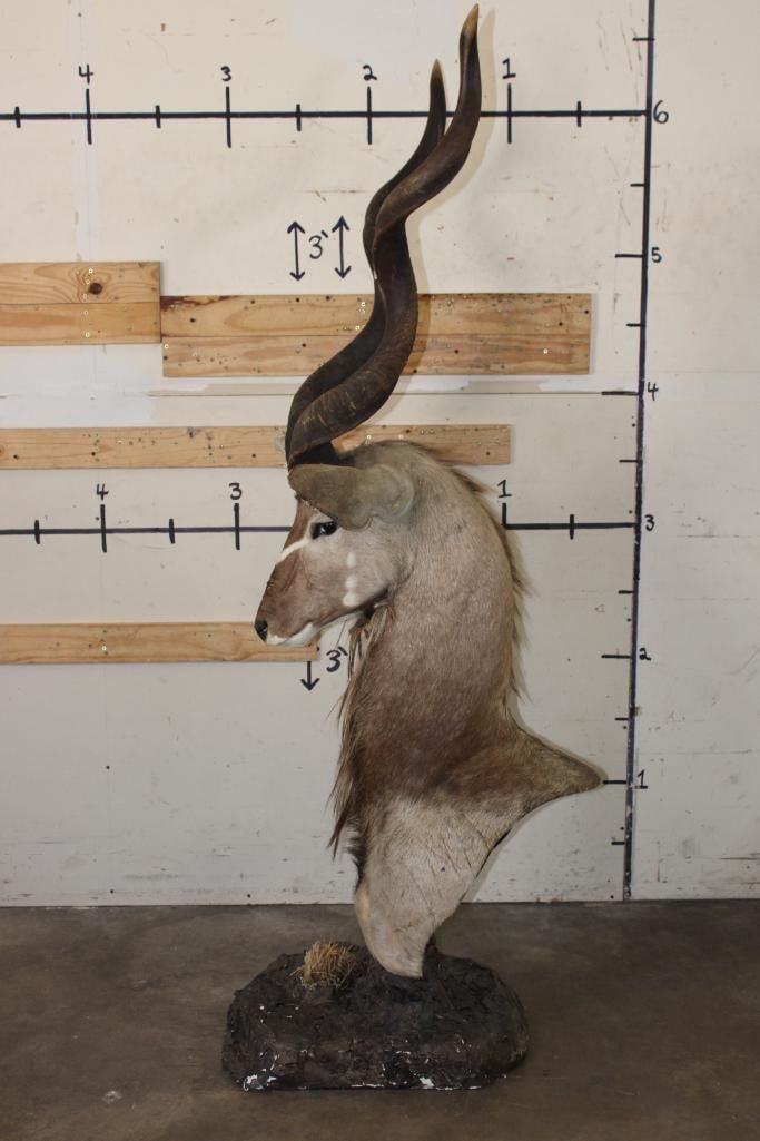 Nice looking KUDU Pedestal Mount. It is mounted on a simulated rock base with a sprig of grass. The Left Horn measures 48.25" around the Spiral Ridge and the Right Horn measures 48.5" around the Spiral Ridge. It is in Fair Condition. TAXIDERMY