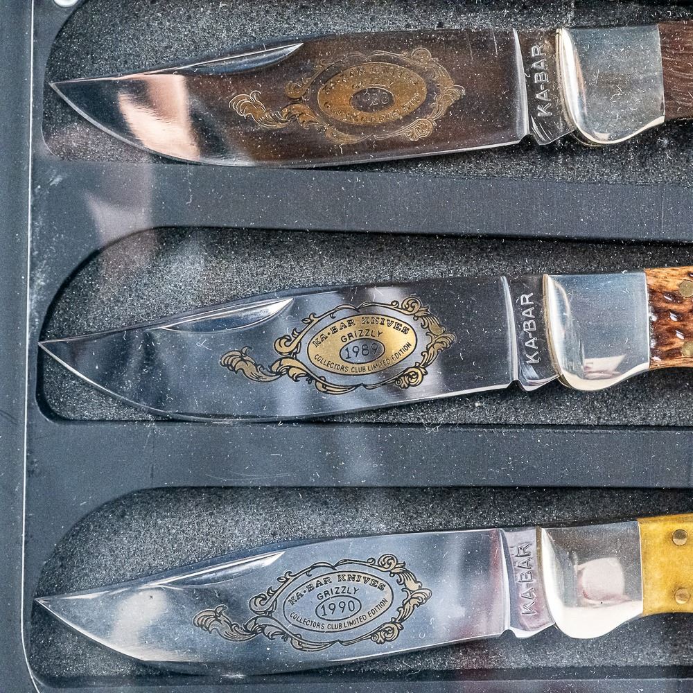 Exceptional 5 knife set of Ka-Bar Cutlery Olean NY made limited edition large folding knives(9" open, 5" closed length). Limited production knives made only during 1986-1990. Knives are all brand new with no wear and come in factory display case still in factory shipping box. Ultimate Ka-Bar collector item. See photos.