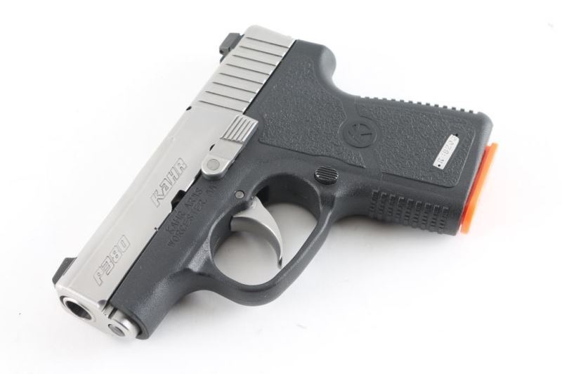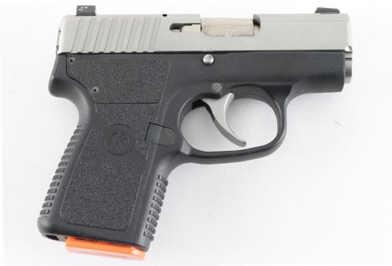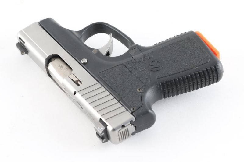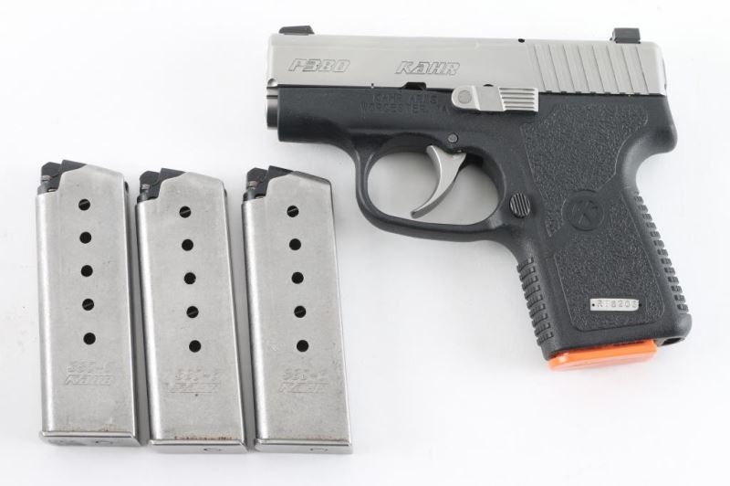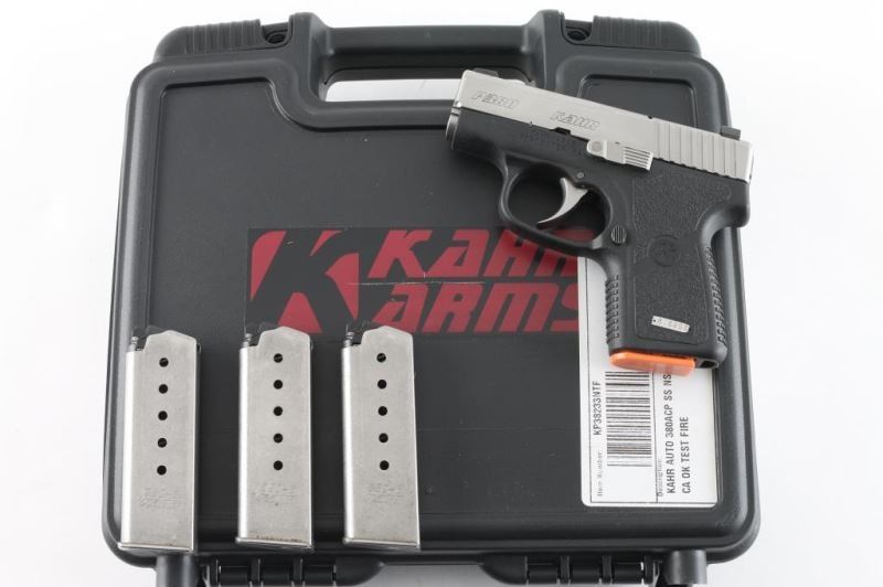 Semiautomatic pistol features stainless steel slide, black polymer frame, double action only trigger, three dot night sights. Condition is like new. Night sights retain strong glow. Includes (3) magazines, manual, Kahr factory black plastic case. Condition is Excellent *** Modern Firearm ***