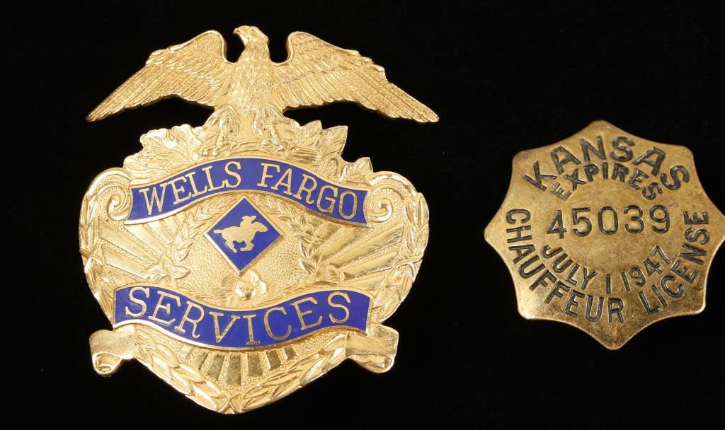 (1) Reads "Chauffeur License Expires July 1943 #4503 in the middle". Vertical pin back. (1) Reads "Wells Fargo Services". Very Good Condition.