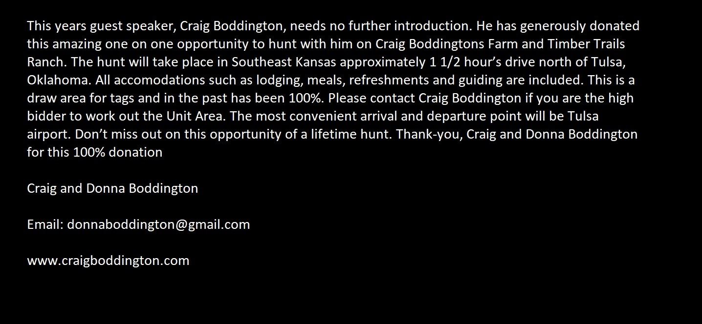 This years guest speaker, Craig Boddington, needs no further introduction. He has generously donated this amazing one on one opportunity to hunt with him on Craig Boddingtons Farm and Timber Trails Ranch. The hunt will take place in Southeast Kansas approximately 1 1/2 hour’s drive north of Tulsa, Oklahoma. All accomodations such as lodging, meals, refreshments and guiding are included. This is a draw area for tags and in the past has been 100%. Please contact Craig Boddington if you are the high bidder to work out the Unit Area. The most convenient arrival and departure point will be Tulsa airport. Don’t miss out on this opportunity of a lifetime hunt. Thank-you, Craig and Donna Boddington for this 100% donation