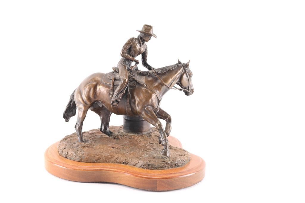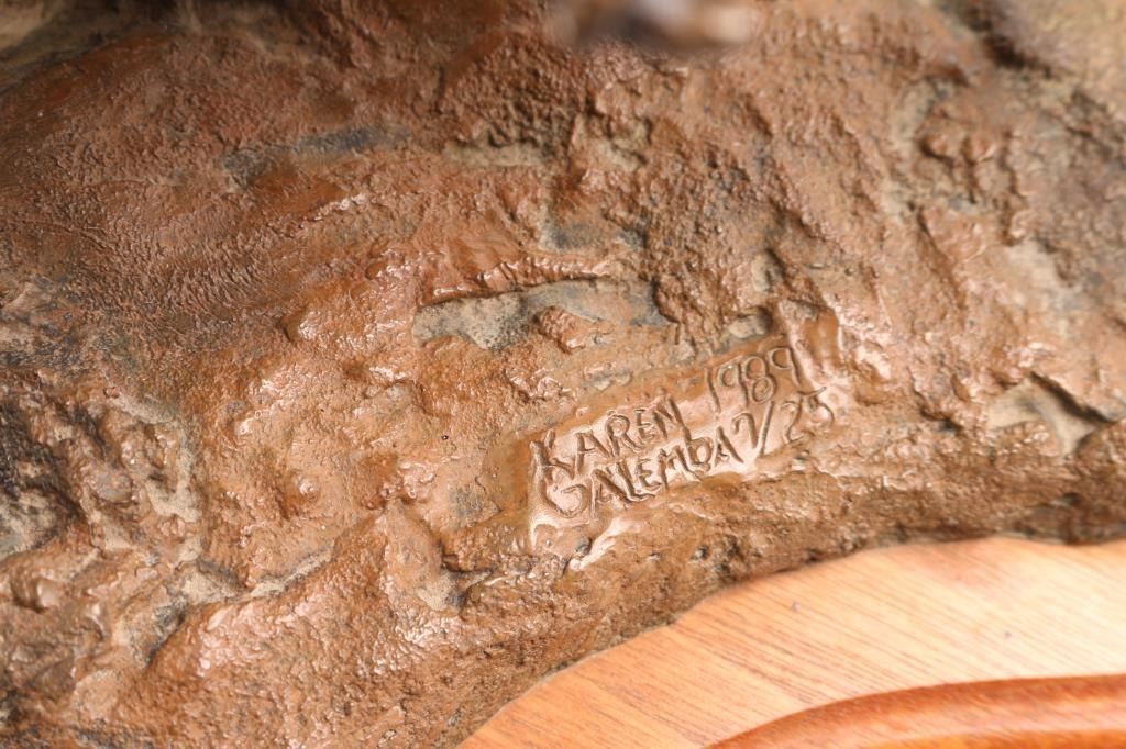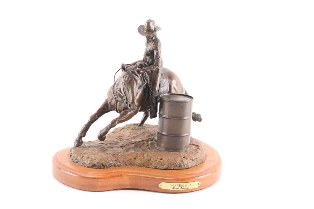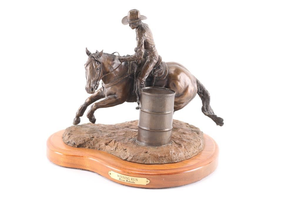 "Winning Run", dated 1989, numbered 7 of 25, by Karen Galemba. Subject is cowgirl on horse barrel-racing. Karen Galemba has been sculpting since May of 1988, when a horseback-related injury kept her out of the saddle for awhile. A four-time National Finals Rodeo qualifier, she has turned her love of horses to a career of immortalizing them in bronze. Although her first works were devoted to horses she has branched out into wildlife as well as human situations.