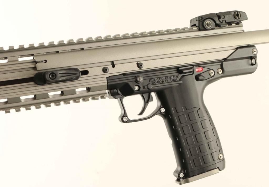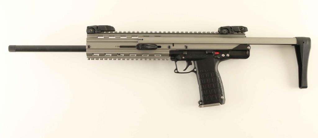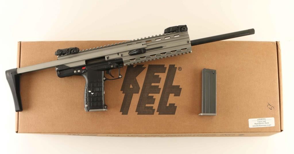 American made blowback operated semi-automatic rifle chambered in .22 Magnum, Features a black 16.1" threaded barrel, Magpul MBUS flip-up sights, Titanium cerakote finished upper receiver with full length optics rail & accessory rail at the 12'o'clock position, ambidextrous non-reciprocating charging handles, smooth polymer trigger, ambidextrous thumb safety, heel magazine release, 30 round magazine, textured black nylon zytel grip frame and six-position telescoping shoulder stock with black nylon zytel buttplate. Includes the original factory cardboard box with manual and spare magazine. Rifle exhibits approximately 99%+ of its original finish with no observed wear. Action is smooth, the bore is pristine and polymer stocks are fine. Condition is like NRA Perfect in box. ***Modern Firearm***