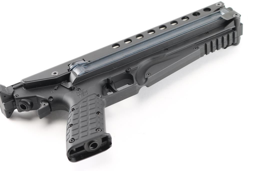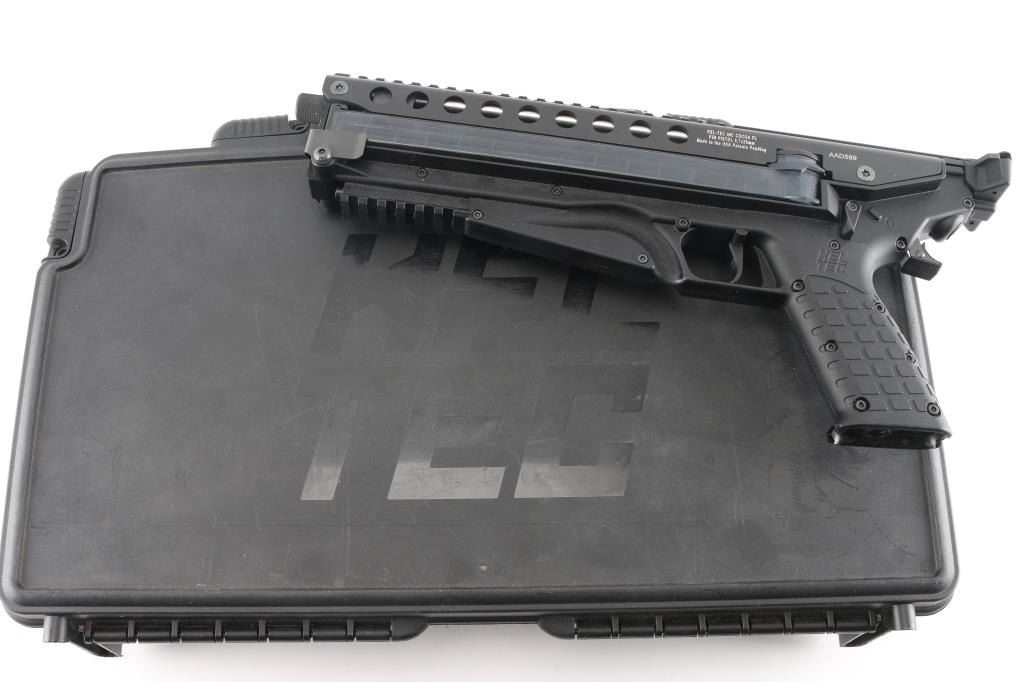 The P50 is a straight blowback semi-automatic pistol that feeds from FN P90 magazines. Like the P90, the rounds are rotated at a 90-degree angle from the magazine into the chamber. A Picatinny rail is located on the upper receiver, and a second rail is located below the magazine. The trigger pull is 5 lb. 9.6" threaded barrel. ambidextrous safety, black polymer stock. The P50 platform is based around a 50 round, double stack magazine which lays horizontally along the top of the grip. Bore is pristine, pistol is in like new condition. Comes in form fitted factory hard case with manual, extra 50 rd magazine, (2) total, nylon sling, trigger lock and sling swivels.
