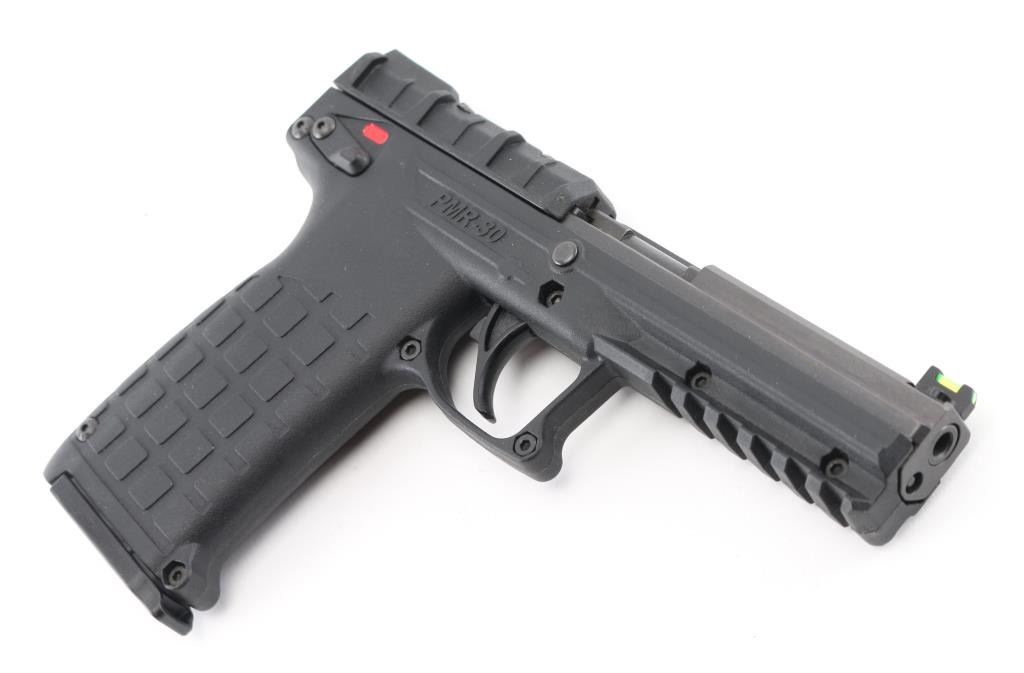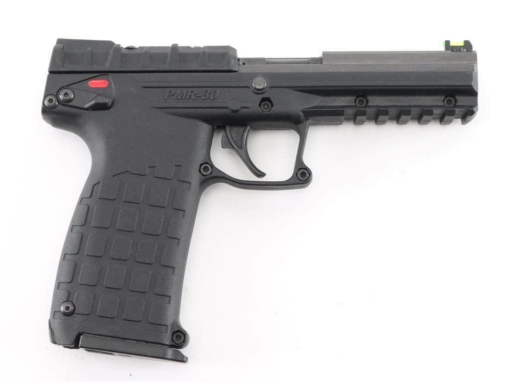 American made lightweight semi-automatic pistol, SA, hybrid blowback/locked-breech system lets you use a wide variety of ammunition and switches between them depending on the pressure of the cartridge, slide locks back after the last shot, approximately 4 1/4" barrel with blued finish,, bore is bright, high visibility fiber optic sights - single green in front sight and double orange in the rear, no exposed hammer, smooth trigger, black polymer frame with textured grips, accessory rail, ambidextrous manual safety, 30-round, double-stack magazine that fits completely in the grip. Includes a Kel-Tec case with instruction manual. **NRA Near Perfect** Modern Firearm