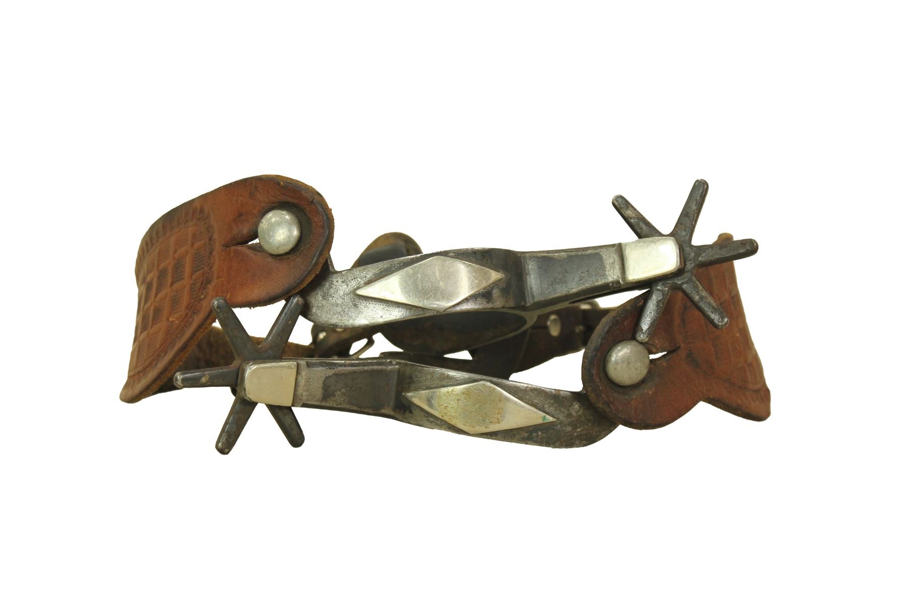 Large pair of double mounted spurs with double diamond pattern and large 5-point rowels, and original straps.
