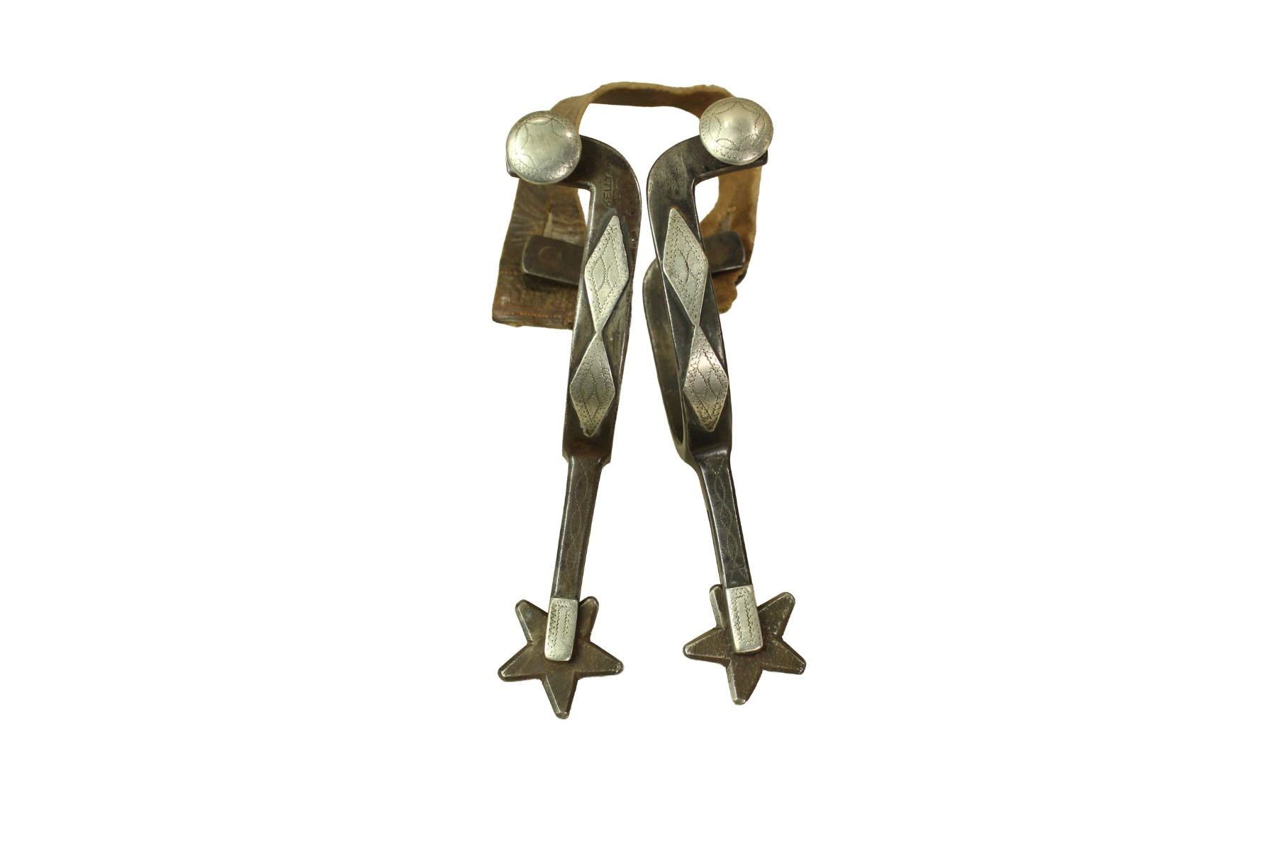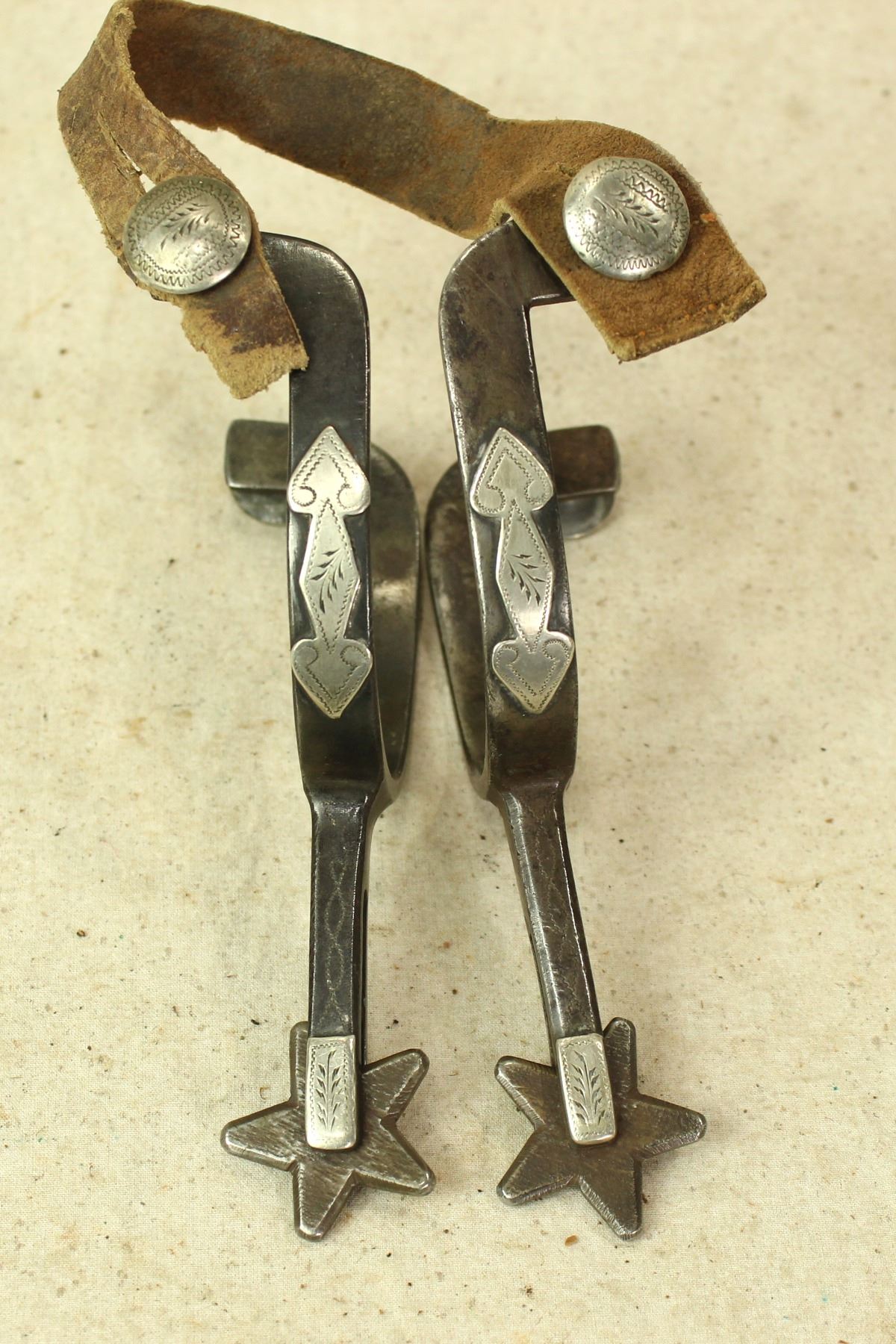 Stylish pair of single mounted straight shank spurs with delicately engraved shanks and five point star rowels.