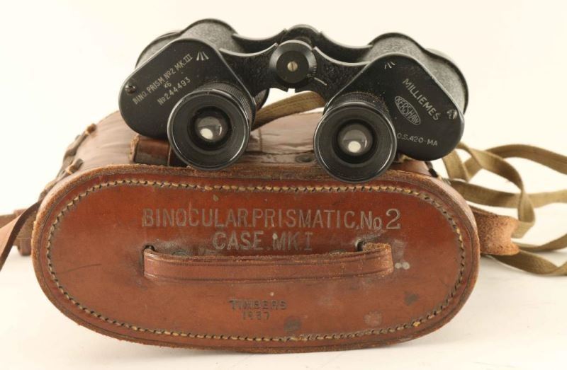 No. 244493 x6 with brown leather case that reads 'Binocular Prismatic No.2 Case MKI Timbers 1937'. From The John F Sukey Collection