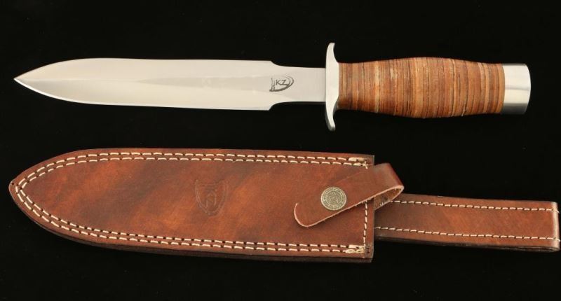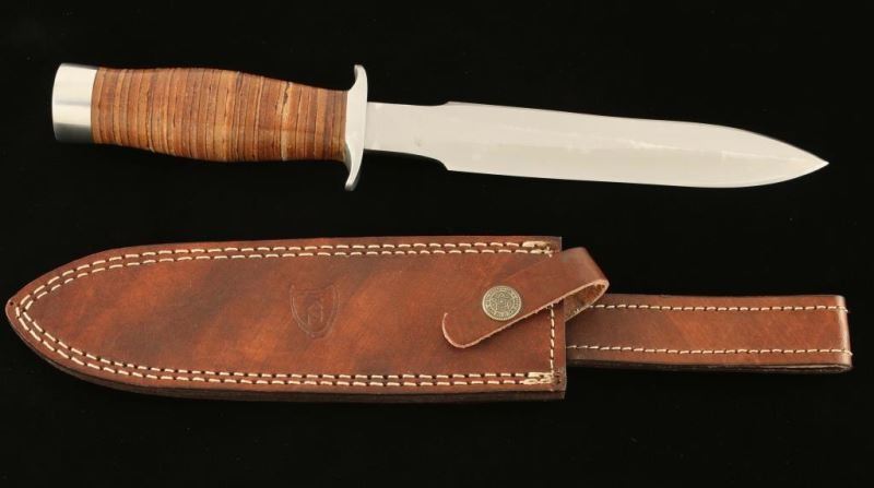 D2 Tool Steel double edged dagger knife with a leather handle and silver/aluminum guard and pommel. The knife is overall approx 13" with an 8" blade and a 5" handle. The high-carbon/high chromium D2 tool steel is forged and properly hardened to 60 HRC with a very shart blade. Comes with a great leather sheath with carry options. Knife and sheath made in North Las Vegas, NV.