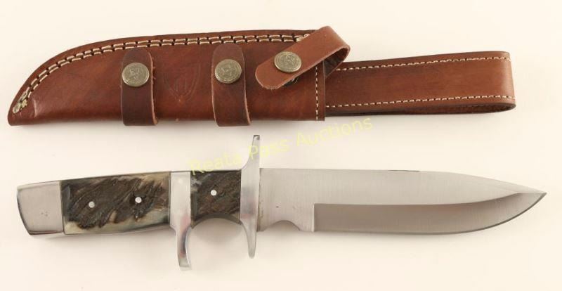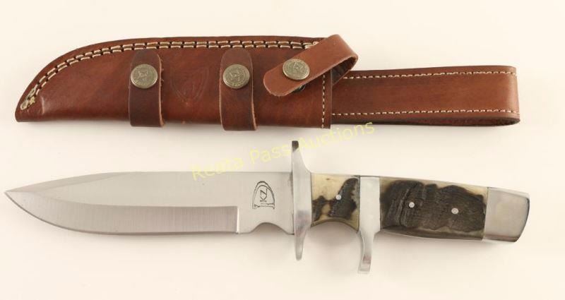 hunter/fighting knife with a ram horn handle. The blade is approx 6", and the handle is approx 5" with a silver/aluminum double guard. 440c steel is super hard stainless ball bearing steel. A high quality sheath is provided for hip or concealed carry.