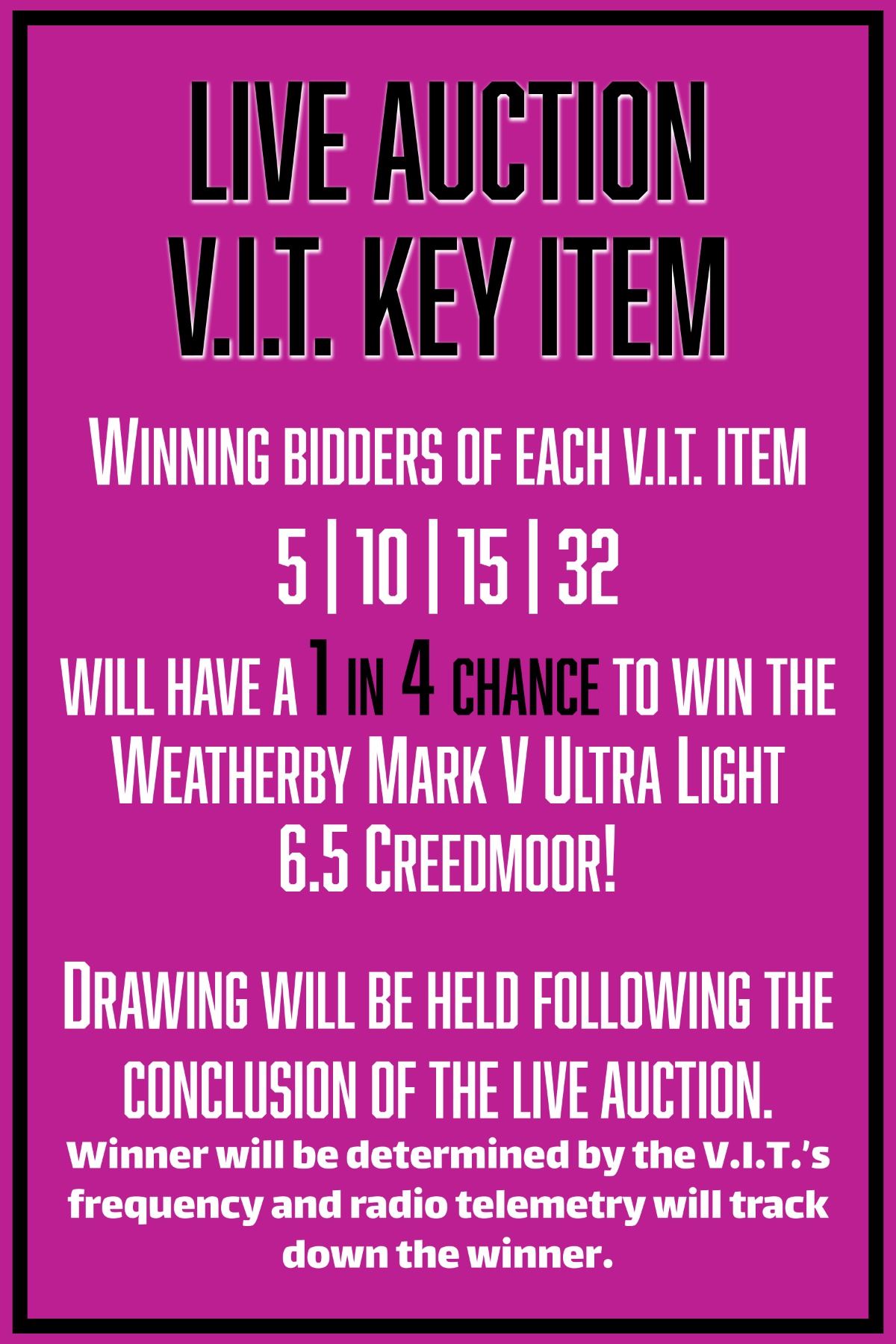 Drawing will be held following the conclusion of the live auction. Winner will be determined by the V.I.T.’s frequency and radio telemetry will track down the winner.