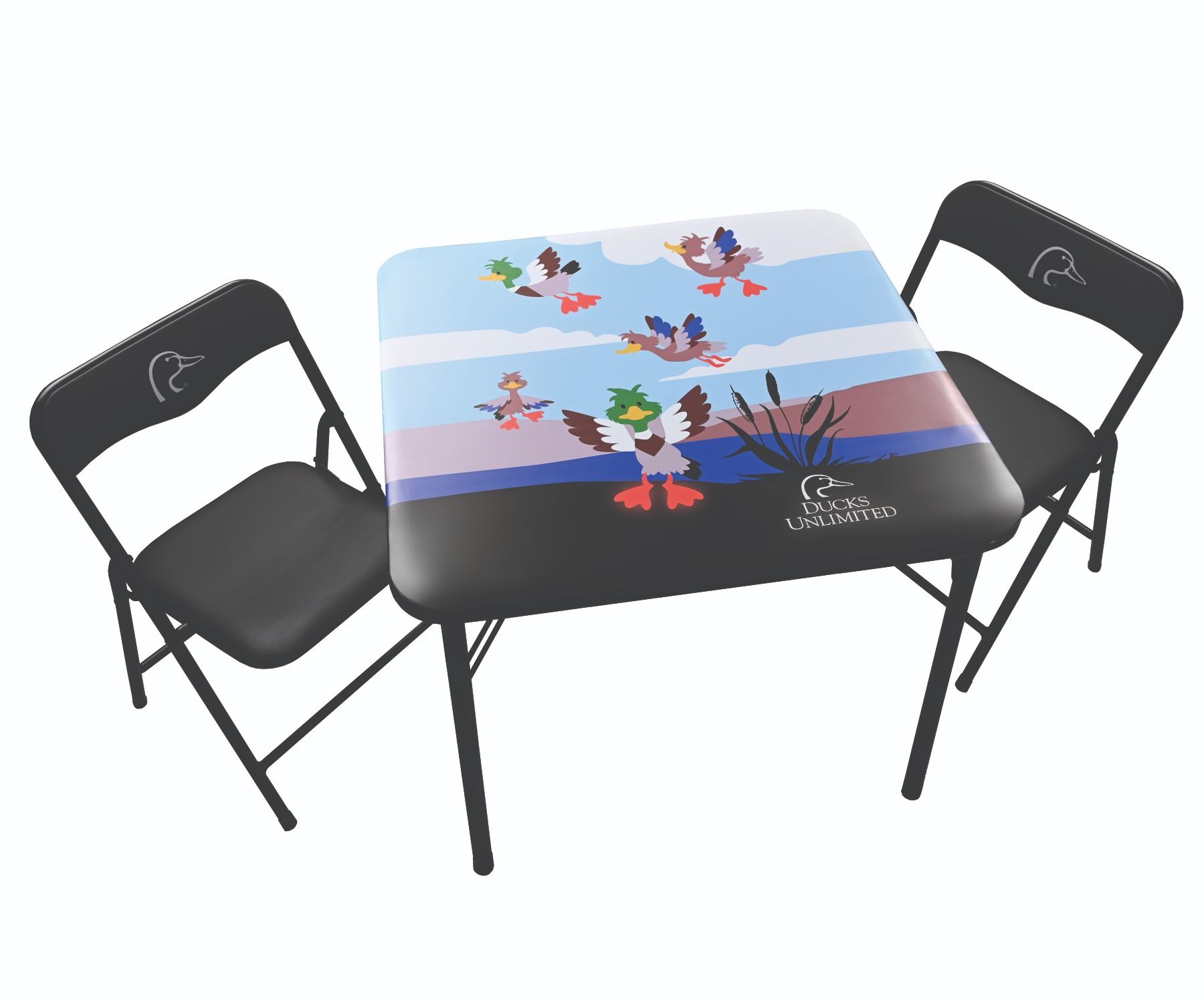 Perfectly sized for kids, this table and chair set blends safety, durability, and playful design. The lightweight black steel frame supports a table and two chairs, each featuring a padded vinyl top with a colorful duck-themed design and the Ducks Unlimited logo. A built-in locking mechanism ensures stability, while the foldable design allows for easy storage when not in use. With table dimensions of 20” x 20” x 16” and chair dimensions of 13” x 11” x 18”, the set offers a fun and practical spot for activities, snacks, and play.