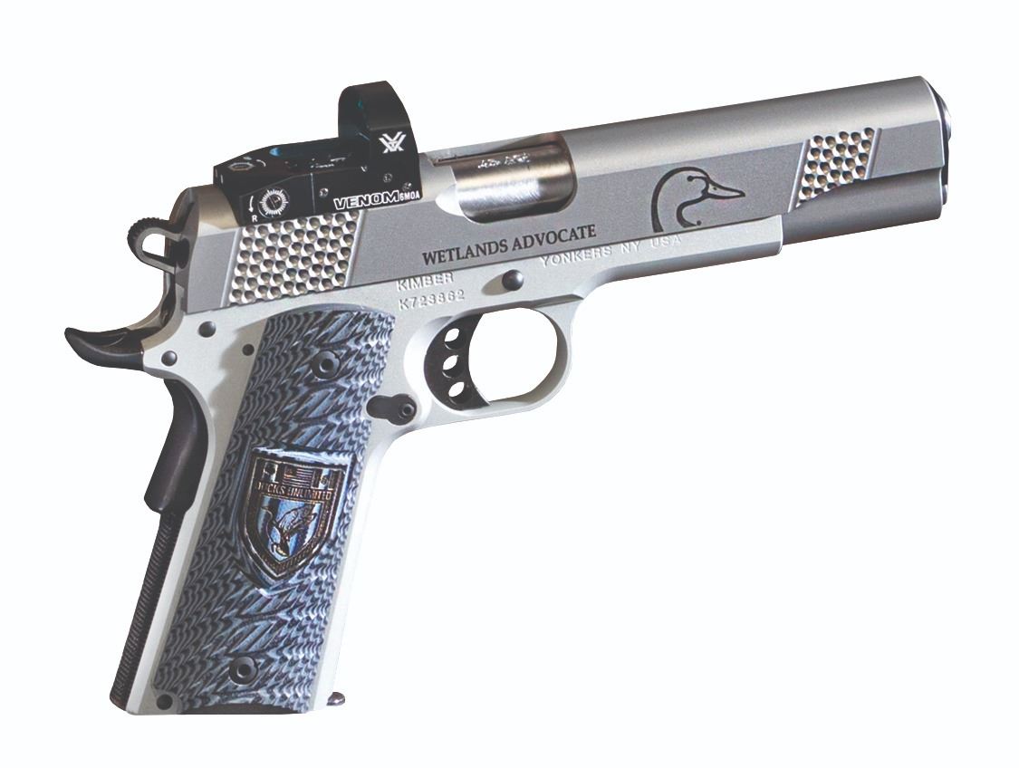 Classic 1911 pistol with modern upgrades. Vortex venom red-dot optic for accuracy and fast target acquisition. 5¼” barrel chambered in .45ACP. Stainless steel slide and frame. Special shot pattern slide serrations. Multi-color DU grips. DU logo displayed prominently on the slide. Special DU serial number. Gun lock included.