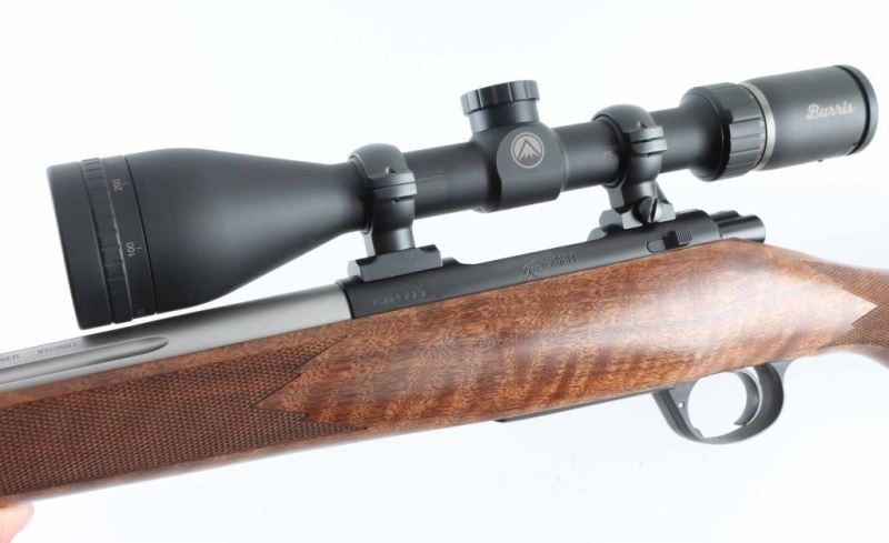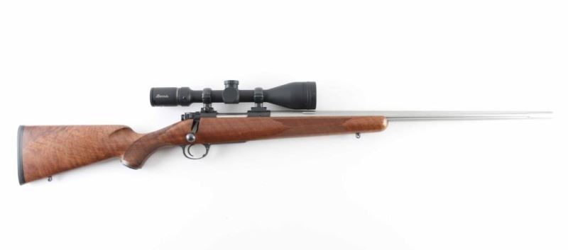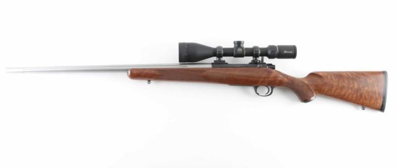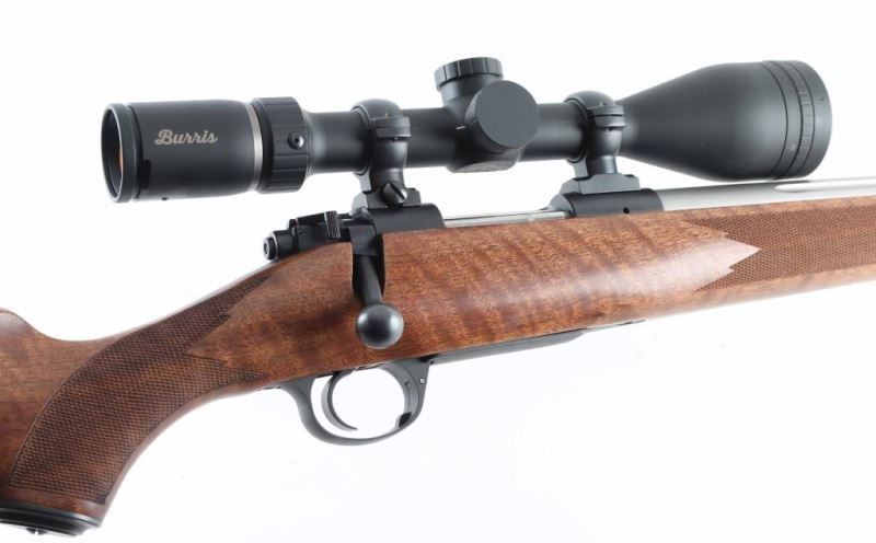 Bolt action rifle features matte blued finish on action, matte stainless 24" fluted barrel, fancy figured walnut stock, checkered panels at wrist & forend, solid rubber recoil pad, sling studs, no sights, two piece Leupold type scope bases & rings, hinged floorplate, manual safety. Bore is excellent. Overall appearance is like new with few signs of handling. Mounts an excellent condition Burris Dropline 4.5-14x42mm scope with adjustable objective, Bullet Drop Compensating duplex reticle and clear view. Condition is NRA Excellent - like new *** Modern Firearm ***