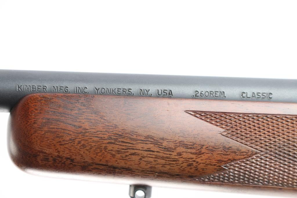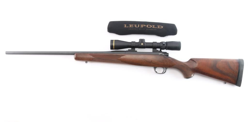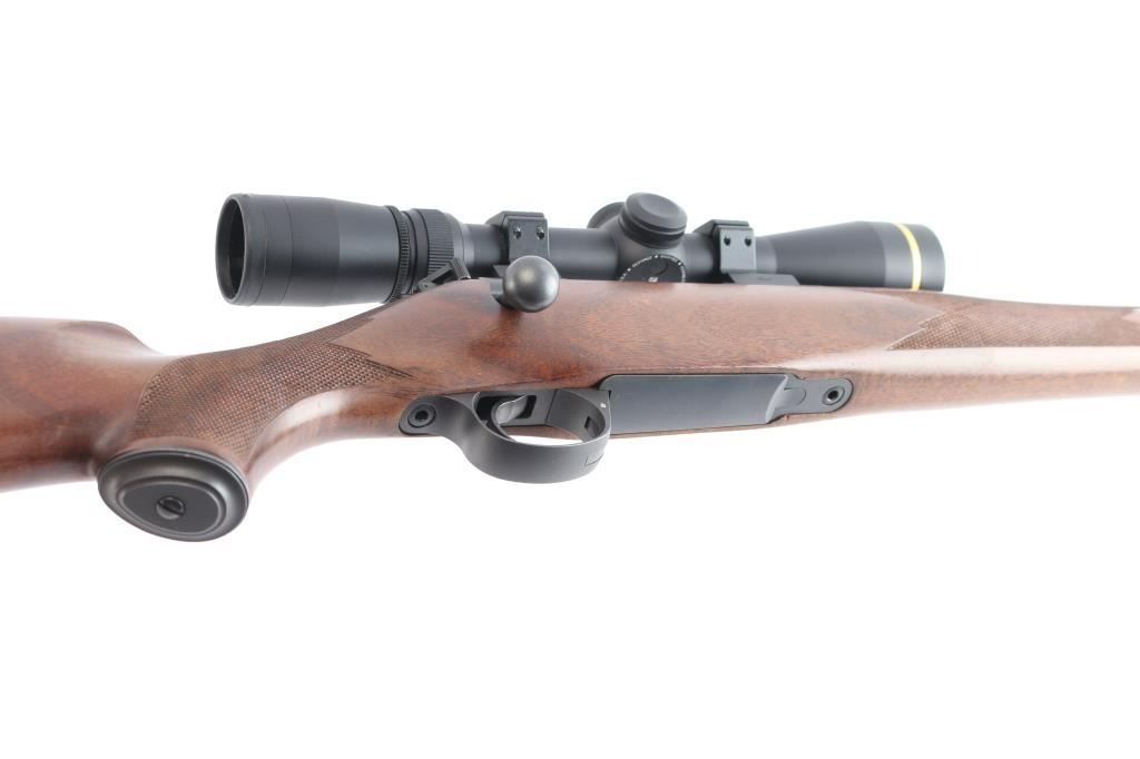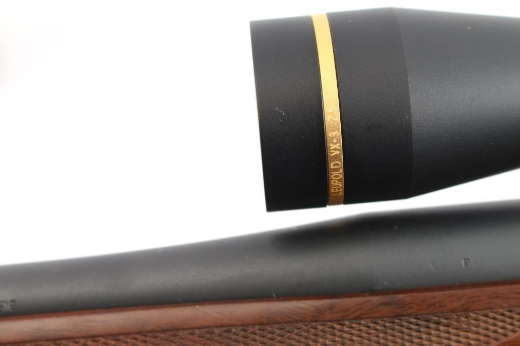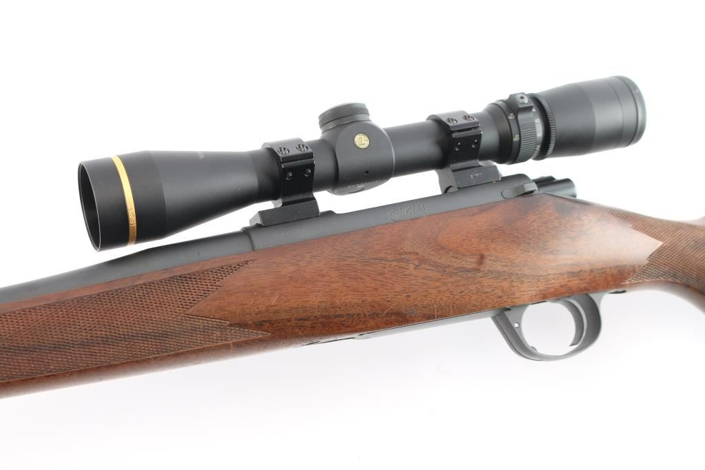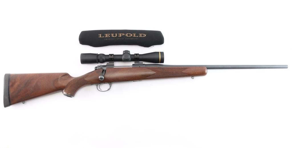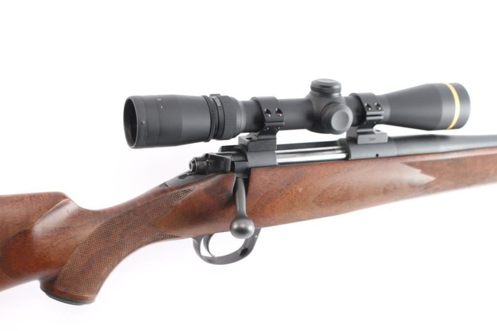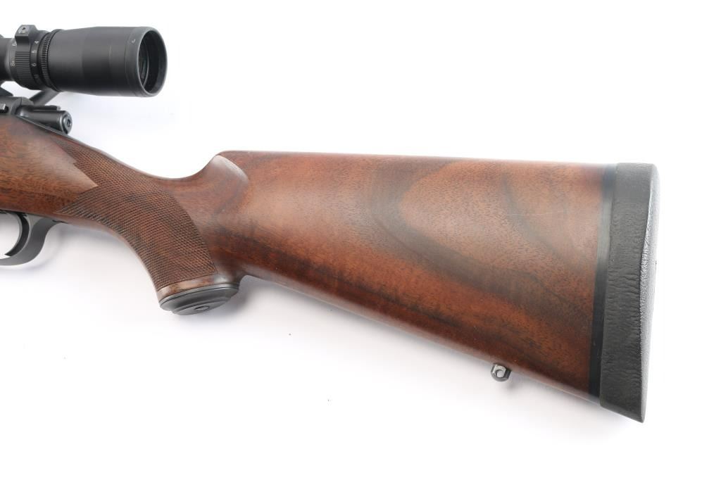 Bolt action rifle features matte blued finish, 22" tapered barrel, fancy figured walnut stock, no cheek piece, checkered panels at wrist & forend, solid rubber recoil pad, sling studs, no sights, two piece Talley scope bases & rings, hinged floorplate, manual safety. Bore is excellent. Overall appearance is excellent with few signs of handling. Mounts an excellent condition Leupold VX-3 2.5-8x36mm scope with duplex reticle and clear view.