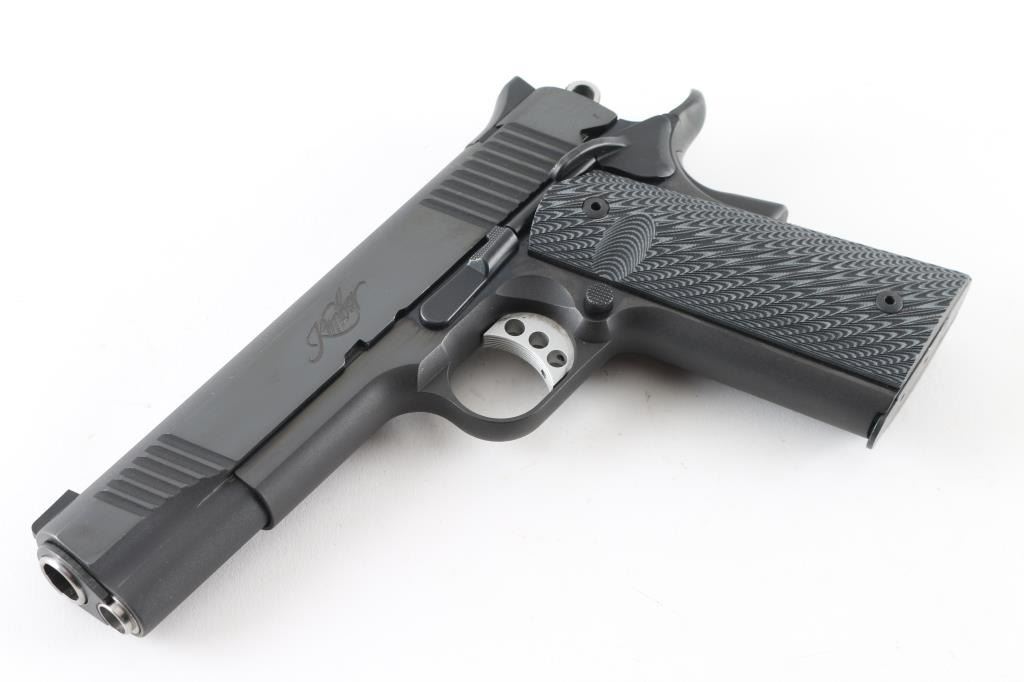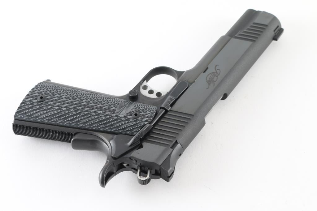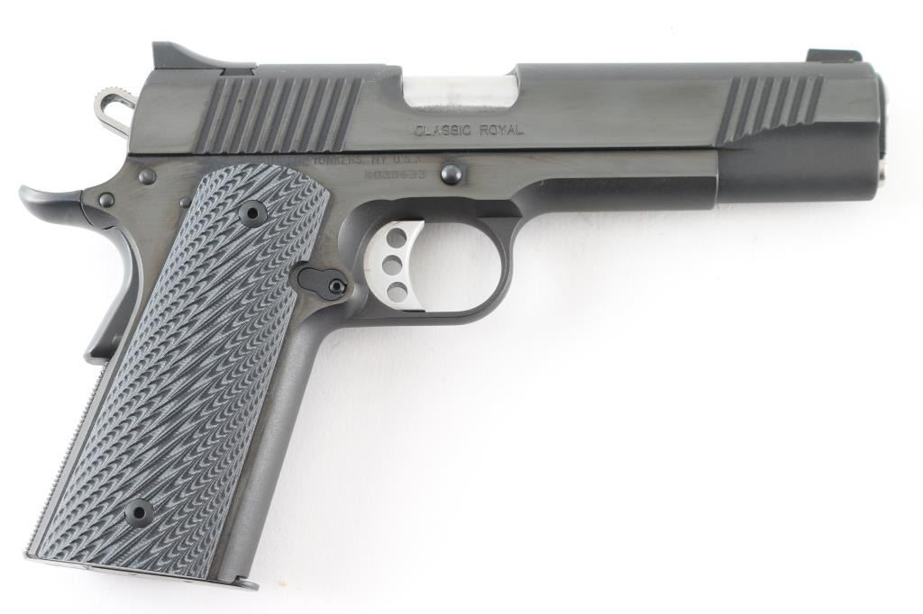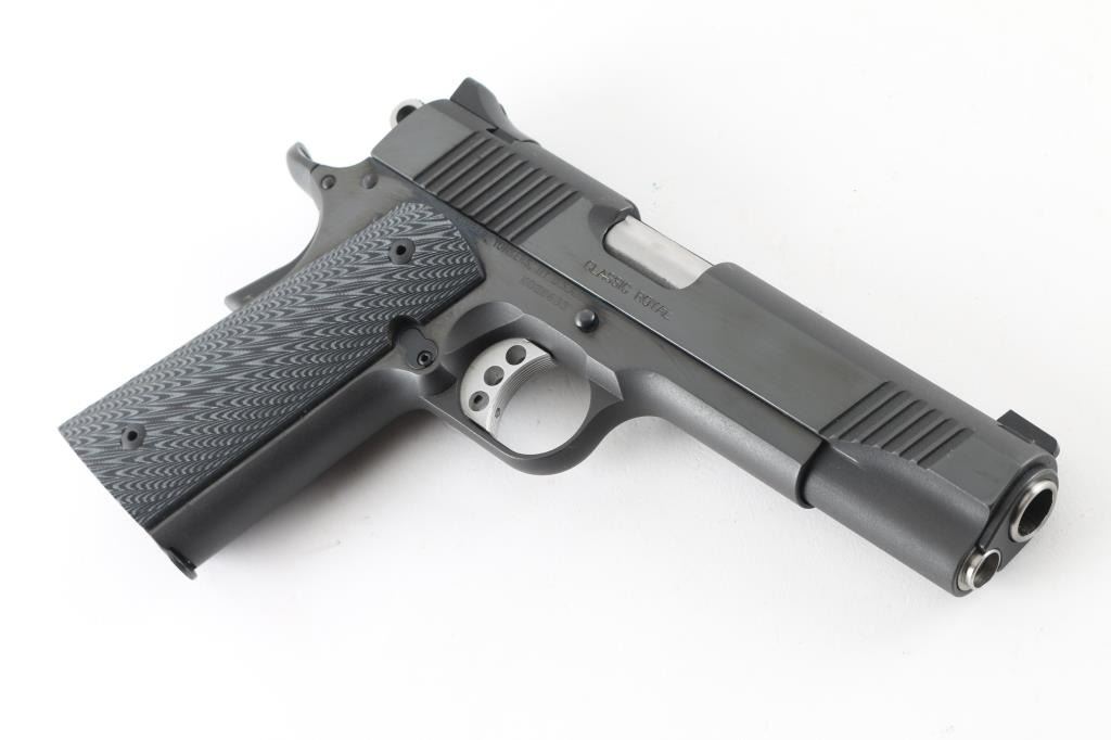 Made in America, the Custom is a full-sized model 1911, with a five-inch barrel. This is a Classic Royal edition. The frame and slide are made of steel. The Custom utilizes a single full-length guide rod, necessitating the serrations on the front of the slide for press checks. Front blade, and square notch rear sights. This gun has a adjustable skeletonized trigger and hammer with a serrated hammer spur. Textured G-10 no slip grips installed. Beaver tail grip safety, checkered main spring housing. Bore is excellent/bright. Pistol is in like new condition. NRA Condition-Excellent. Modern firearm