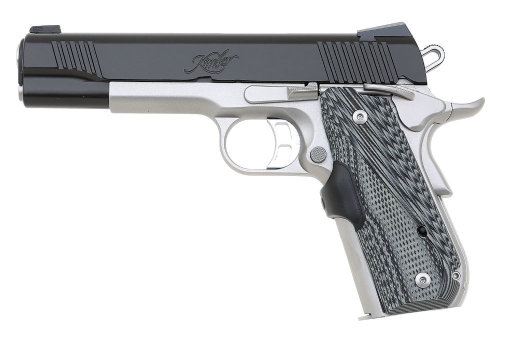 serial #K478505, 45 ACP, 5'' barrel with an excellent bore. The slide surfaces retain about 99% Kimpro II finish, the slide is black and the frame and moving parts are matte silver. The gray and black laminate Crimson Trace grips are about excellent, they are uniquely patterned and the red dot is bright, there is an on/off toggle switch on the left grip panel and the laser is pressure activated, the small ''Danger'' laser stickers are present on the right of the frame and slide. The Tritium night sights glow bright green, the mainspring housing is rounded and the trigger is adjustable. Included is a factory hard case with related paperwork, laser manual and laser adjustment tools. (11739-115) {MODERN} (1000/1500)