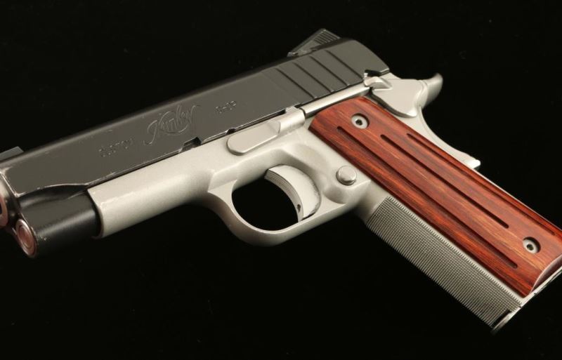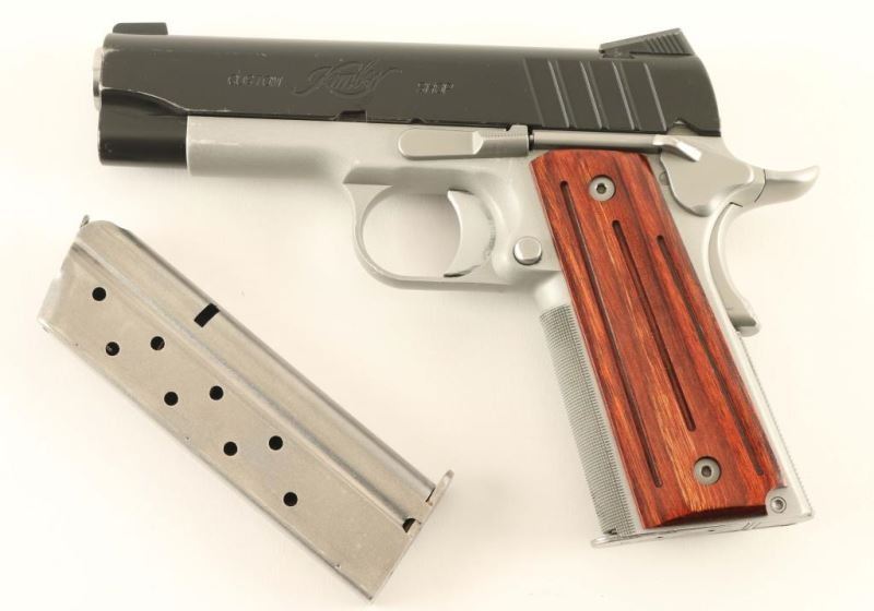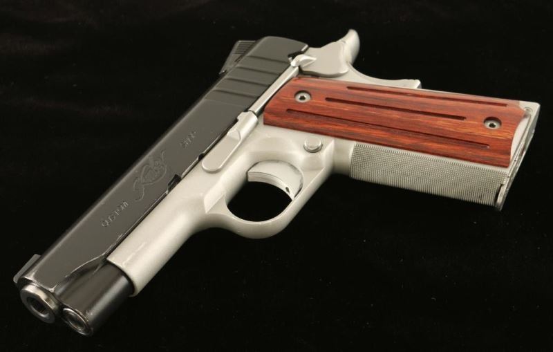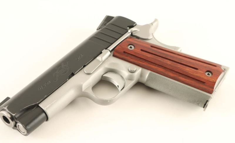 Premium quality 1911-A1 style single action semi-automatic compact pistol chambered in 9x19mm. Features a matte black coated slide w/ carry melt treatment, match grade 4" bushingless stainless steel barrel, full-length steel guide rod, dovetailed low-profile night sights, serrated adjustable trigger, bobbed hammer, thumb safety, beavertail grip safety, satin silver finished aluminum frame with finely knurled front strap, push button magazine release, factory 9 round magazine, and two-piece grooved rosewood grips. Includes the original factory hard case with manual, tools and spare magazine. Pistol exhibits approximately 90% of it's original finish showing mild holster wear. Action is smooth, bore is pristine and grips are near fine. Condition is NRA very good+++. ***Modern Firearm***