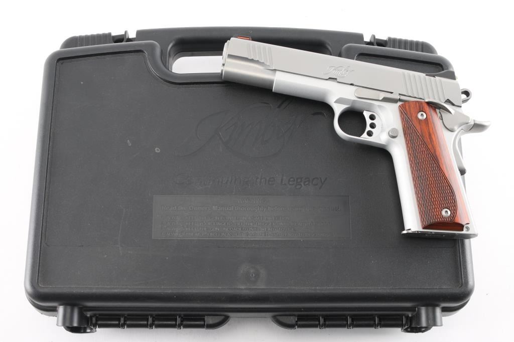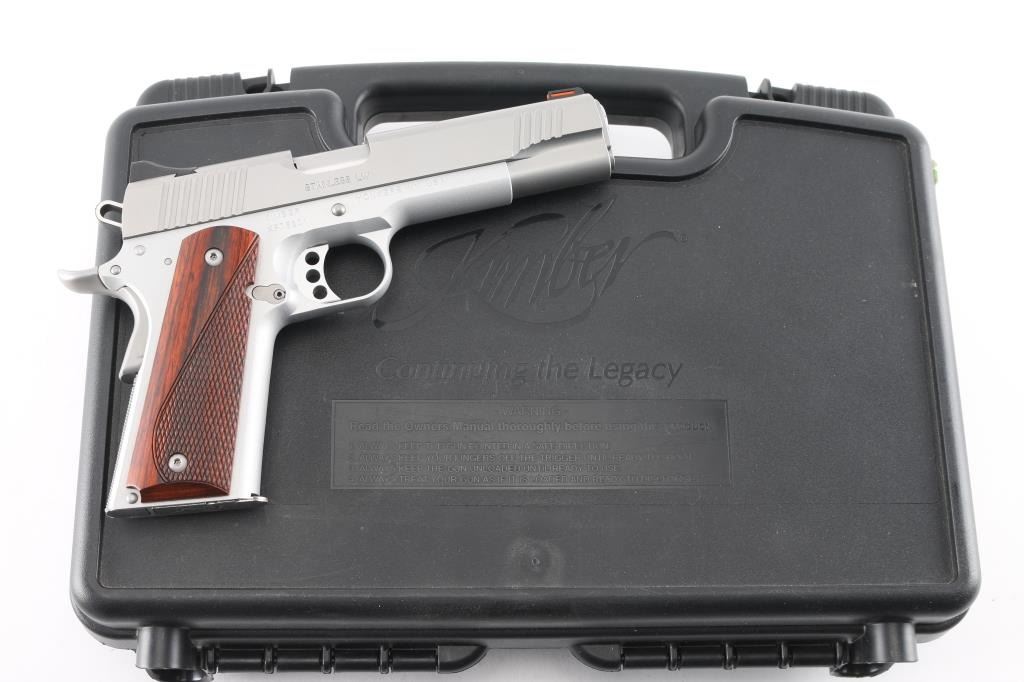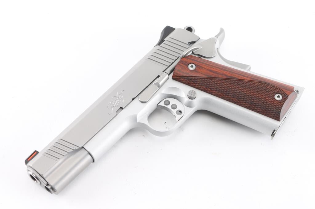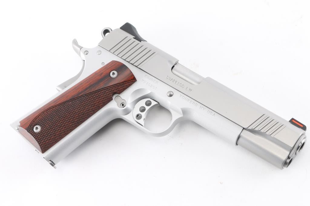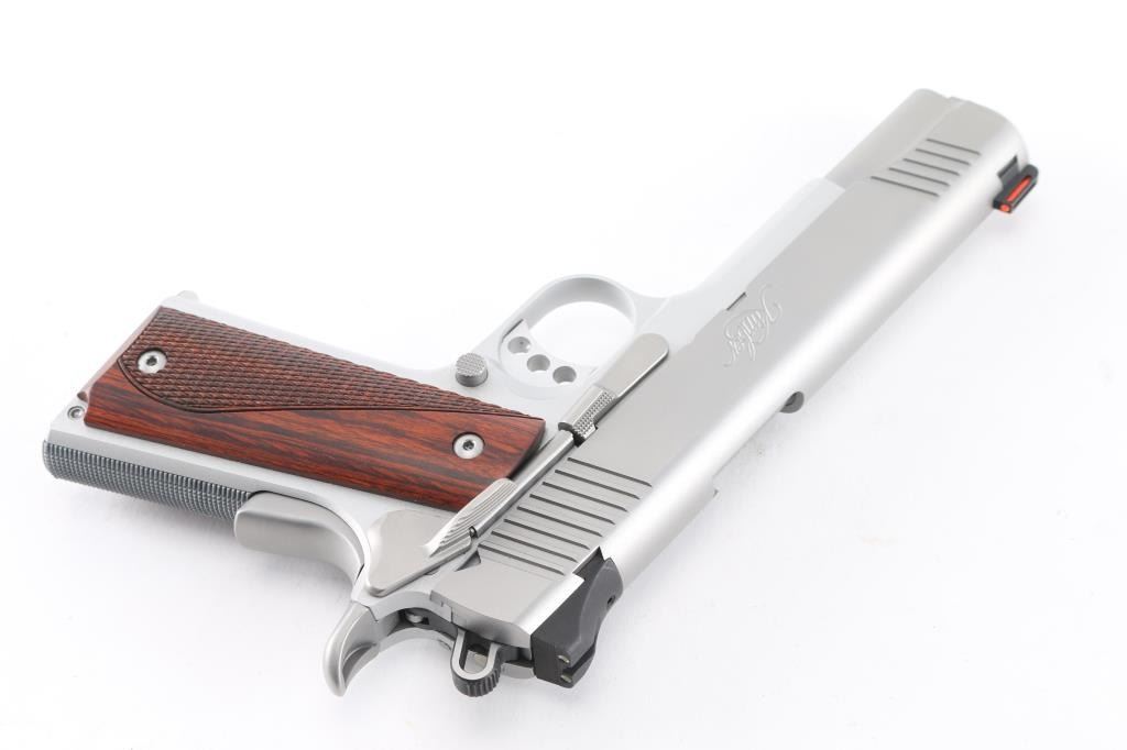 High quality semiautomatic pistol chambered for 9MM. Features stainless steel finish, 5" barrel, extended manual safety, beavertail grip safety, adjustable overstop trigger, flat checkered mainspring housing, full length recoil spring guide, beveled magazine well, dovetail mounted 3 dot sights with orange fiber optic front insert, slide serrations front & back, double diamond checkered/smooth wood grips, skeletonized, adjustable trigger. Bore is pristine. Finish is excellent with minor handling marks. Includes (2) blued & (1) stainless magazine, factory plastic carry case with matching label, manual, lock and bushing wrench.NRA condition-Excellent. Modern Firearm.