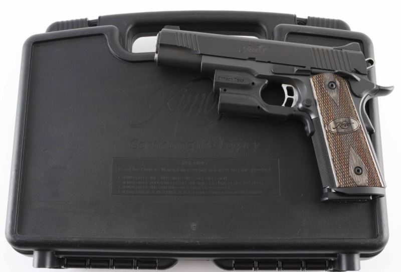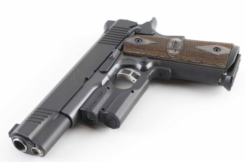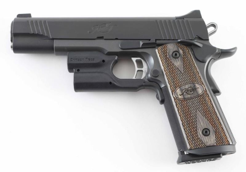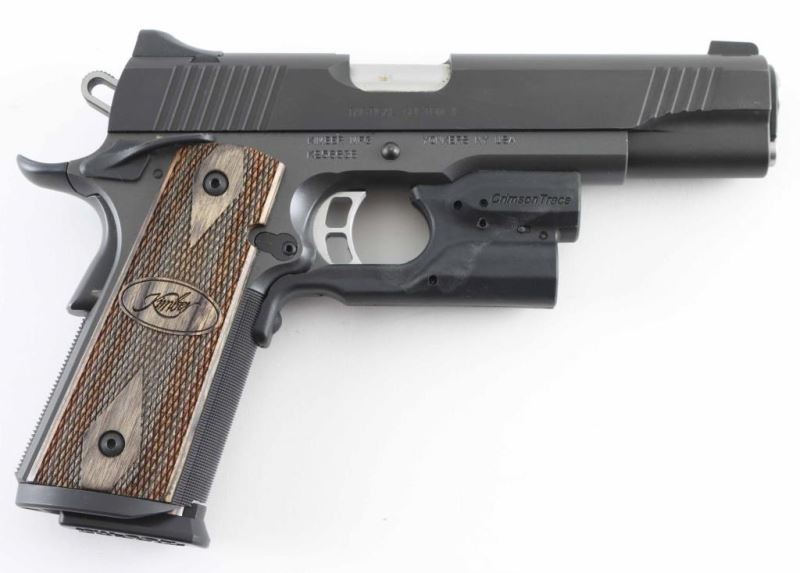 High quality semiautomatic pistol chambered for 45 ACP. Features two tone finish (dark gray slide and controls over medium gray frame), 5" barrel, extended ambidextrous manual safety, beavertail grip safety, adjustable overstop trigger, flat checkered mainspring housing, checkered front strap and bottom of trigger guard, full length recoil spring guide, wide magazine well funnel, dovetail mounted 3 dot night sights, double diamond checkered Kimber logo grips. Mounts a Crimson Trace green laser clamped around front of triggerguard. Bore is very good condition, dirty from firing, needs cleaning. Finish is excellent with minor handling marks. Night sights retain their glow. Laser tests good for operation. Includes (1) magazine, factory plastic carry case. Condition is NRA Excellent *** Modern Firearm ***
