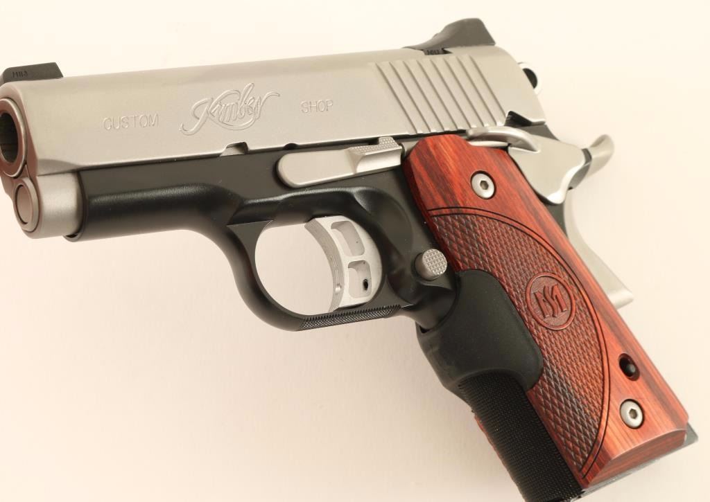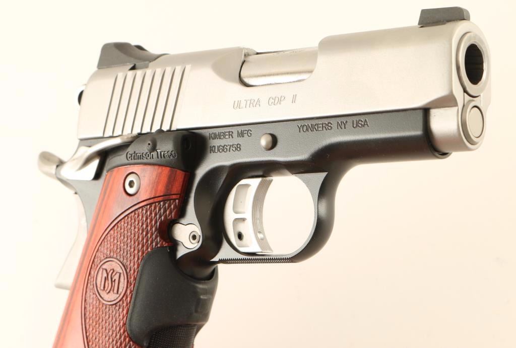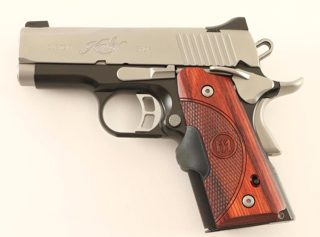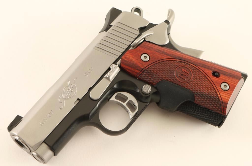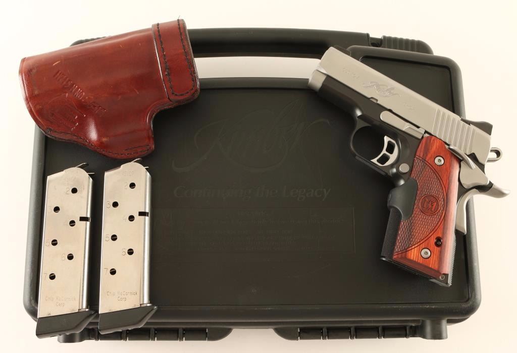 Premium quality lightweight 1911-A1 style semi-automatic compact pistol chambered in .45 Automatic. Features a satin stainless/matte black dual tone finish, carry melt treatment, 3" stainless steel barrel, dovetailed three-dot night sights, skeletonized hammer, serrated adjustable trigger, ambidextrous thumb safety, beavertail grip safety, checkered mainspring housing, push button magazine release, factory 7 round magazine, aluminum frame with finely checkered trigger guard & front strap, and Crimson Trace Master Series laminated rosewood laser grips. Includes the original factory hard case with documents, lock, Don Hume brown leather holster and two Chip McCormick 7 round magazines. Pistol exhibits no major wear to it's finish but the top of the mainspring housing has broken off. Action is smooth, bore is pristine and grips are fine. Condition is near excellent in case. ***Modern Firearm***