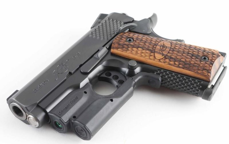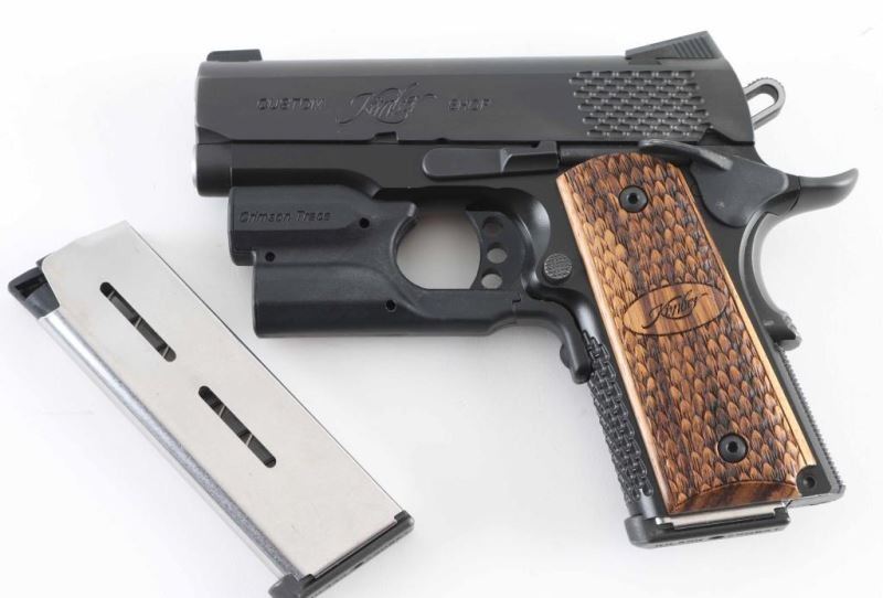 High quality 1911A1 style single action semi-automatic compact pistol chambered in .45 Auto. Features a matte black finish, scale textured top strap & rear cocking serrations, bushingless 3" stainless steel barrel, full-length guide rod, dovetailed three-dot night sights with drift adjustable rear sight, serrated match grade trigger with overtravel adjustment, skeletonized hammer with serrated spur, ambidextrous extended safety on the frame, upswept grip safety with memory bump, push button magazine release, matte black aluminum frame with scale serrations on the frontstrap, knurled flat mainspring housing, and zebrawood grips with scale pattern texturing & laser cut Kimber insignias. Mounts a Crimson Trace green laser clamped around front of triggerguard. Bore is very good condition, dirty from firing, needs cleaning. Pistol exhibits minor handling marks. Action is smooth and the grips are fine. Laser is operational, and night sights retain a dim glow visible in low light. Includes factory hard case, (2) Wilson Combat magazines. Condition is NRA Excellent *** Modern Firearm ***