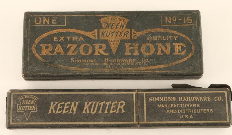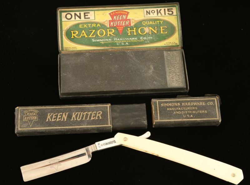 Bakelite handle, mother of pearl blade handle put out by the Simmons Hardware Company. Includes one #15 razor home. Both have original cases.