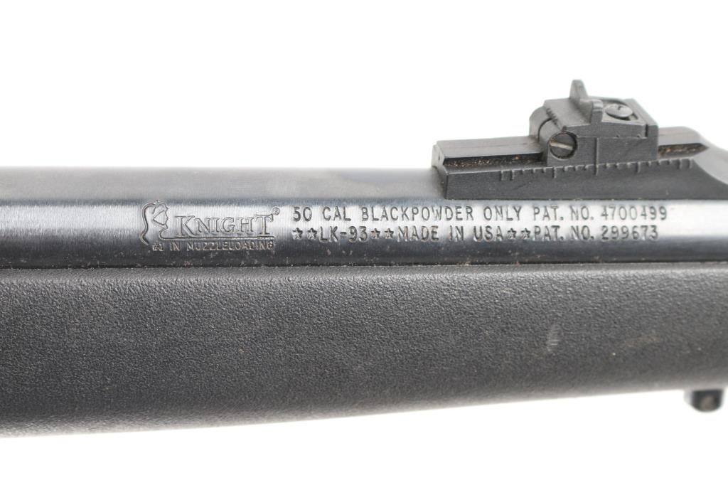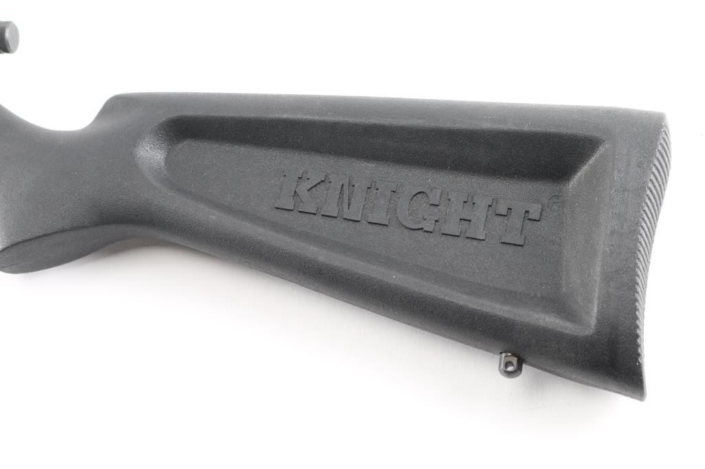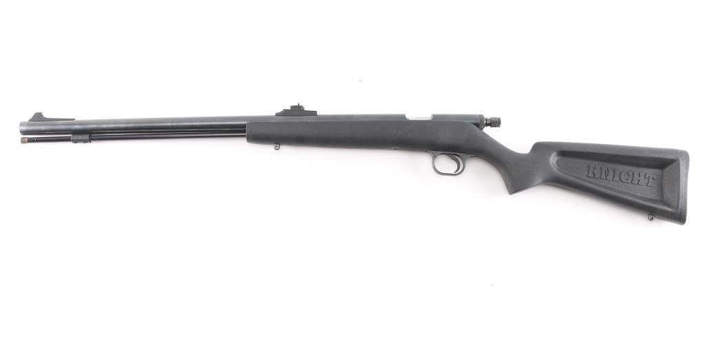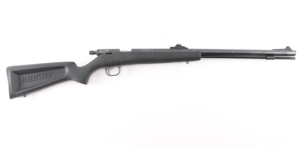 Modern, .50 caliber muzzle loading rifle utilizing a straight pull style action. On Field & Streams 50 Best Guns Ever Made list. Features a blued finish, 23" heavy barrel, blade/bead front, adjustable u-notch rear sights, drilled & tapped receiver, manual safety, serrated trigger, ram rod, swivel studs and black synthetic pistol grip shoulder stock with recoil pad. Rifle shows little to no wear. Action is smooth, bore is excellent and synthetic stock is fine. Condition is NRA Excellent. Antique Firearm