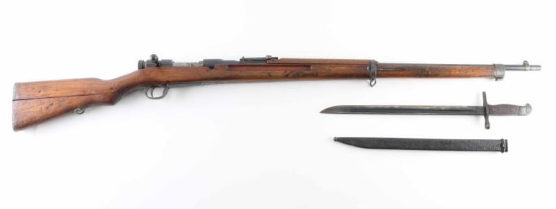 "Unground Chrysanthemum" 'M1905' Japanese military bolt action service rifle features a blued finish, 31.5" barrel, inverted 'v' front sight, flip-up ladder style rear sight graduated to 2,400 meters, two barrel bands with bayonet lug on the forward band, smooth trigger, straight bolt handle with "plum" shaped knob, 5 round internal box magazine with quick detach floorplate, sling swivels, smooth wood handguard and full-length semi-pistol grip shoulder stock with finger grooves in the forend & smooth metal buttplate. No import marks are found, the mum on the receiver ring has not been ground. Mismatched bolt. Bore is poor to fair condition, dark & lightly pitted in grooves with strong rifling. Retains 50% blue, turning brown or showing patina in many places, significant pitting on exposed portions of barrel and on sides of receiver. Wood is good condition, showing staining and some loss of finish, slight gap at butt join. Buttplate missing lower screw. Includes a good condition bayonet (manufactured by Toyoda Jidoshoki Seisakusho - Toyoda Automatic Loom Works) with stained & lightly cracked grips, evenly pitted scabbard. Condition is NRA Good - missing buttplate screw *** C&R Firearm ***