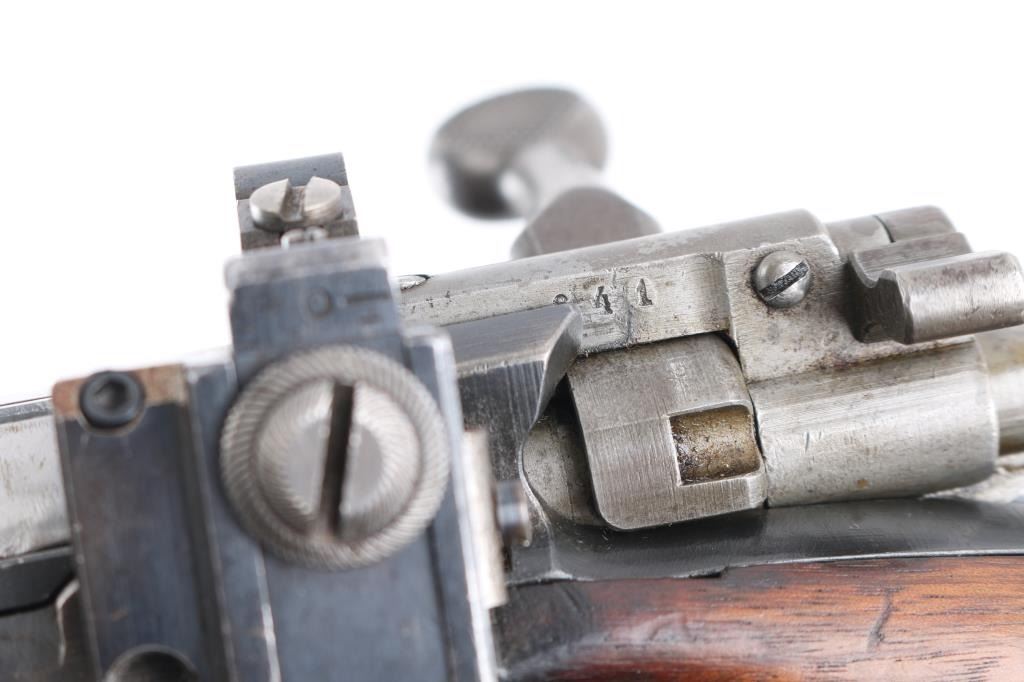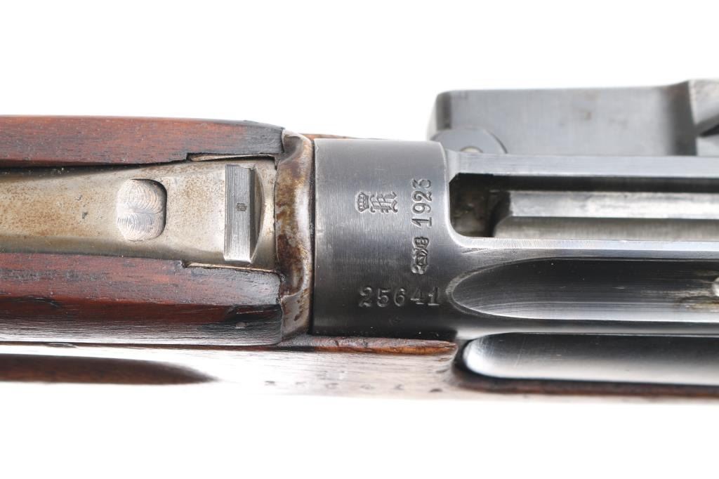 SN: 25641 Sporterized Norwegian Military rifle. The Kongsberg Arsenal in Norway manufactured the Krag-Jorgensen Model 1912 carbine from 1912 until 1935. There is no visible import mark. The top of the receiver is marked with the Kongsberg Arsenal mark “crown / K” and “1923”. The left side of the receiver is marked with a “crown/letter” stamping and with a small Norwegian stamping. Matching serial numbers are found on the receiver, stock, trigger guard, bolt assembly, barrel band, and the steel buttplate. Bolt handle is non-matching #479. Front sling swivel is a replacement. Bore is fair, good rifling, dark frosting in the grooves. 24" barrel, flat, knurled bolt knob. The rifle has been sporterized by removing the rear sight and installing a Redfield peep sight on the left receiver, shortening the forearm by 2 1/2" and moving the barrel band back, grinding off the bayonet lug and adding checking to the wrist and the underside of the fore stock.