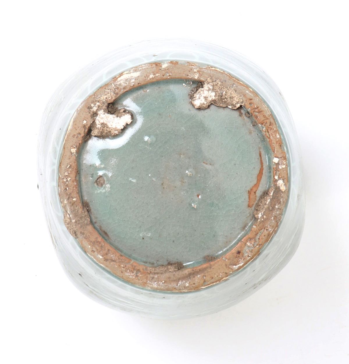 Beautiful Korean ceramic green crackle glazed jar. Decorated throughout with incredible attention to detail. Including blooming flowers, cranes in flight among the clouds, and perfect petal boarders to the shoulder and base. Lovely light green crackle glaze throughout. Size 10 1/2" H x 6 1/2" W. Condition: Wonderful overall condition with no obvious signs of restoration or repair. Raw unglazed foot.
