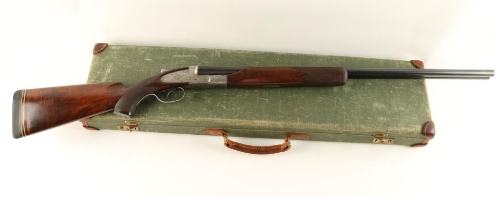 L.C. Smith Skeet Special SxS shotgun, 20 gauge, 28” ventilated rib barrels, S/N FWE148415, blued finish, engraved receiver, Hunter One Trigger, checkered wood stocks with added Decelerator hard rubber butt pad. This shotgun is in overall verygood to fine condition displaying the majority of its blued finish on the barrel assembly; the bores are fine, the actions good and the wood stocks are very good to fine showing normal handling and wear. The gun is contained in a luggage stylelined compartment hard case that includes an L.C. Smith marked Special tool for cocking the hammers of the lock plate and keys to the locks of the case. (Modern). Est.: $1,200-$1,800.
