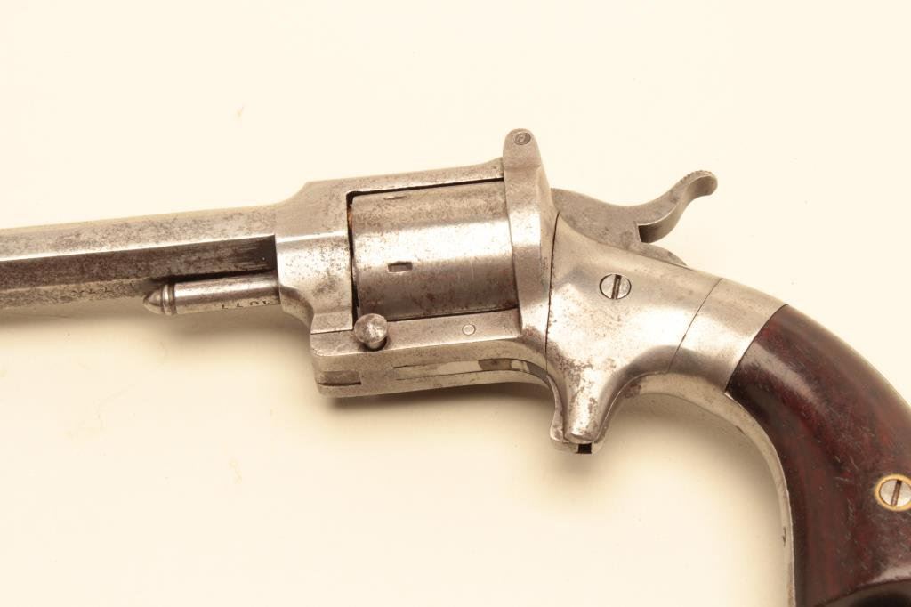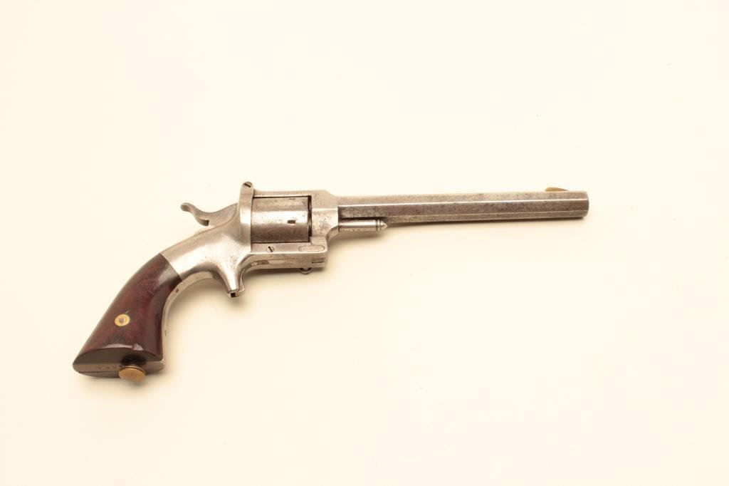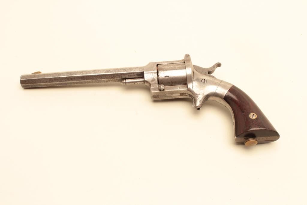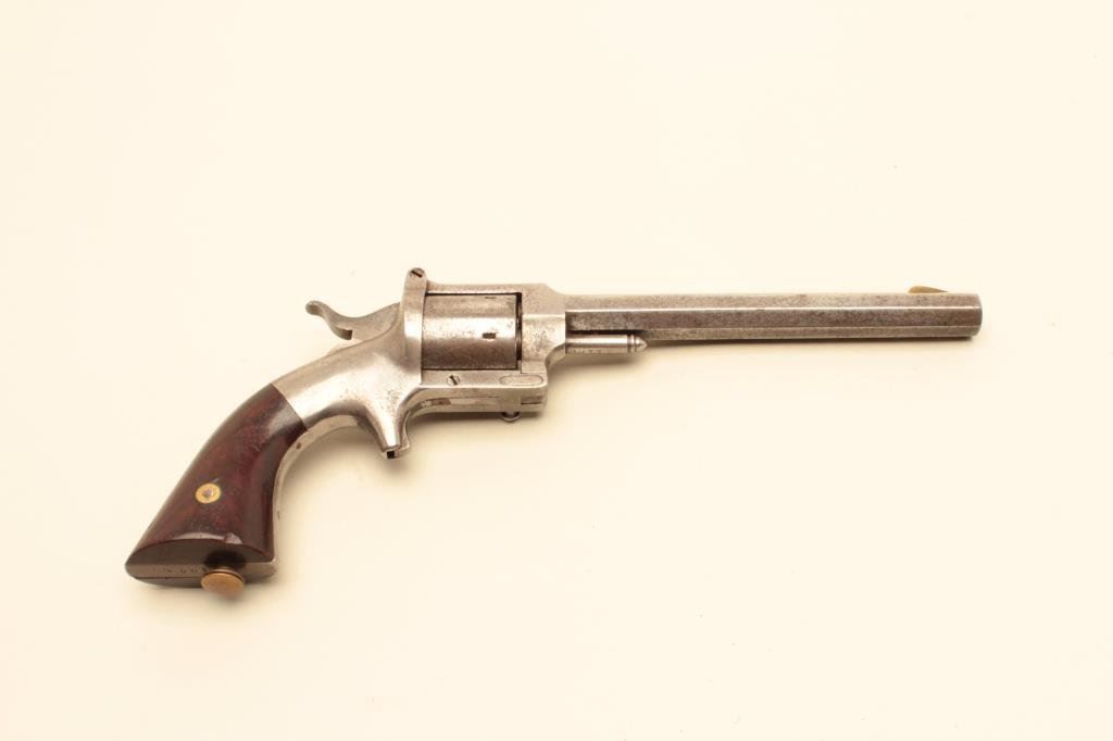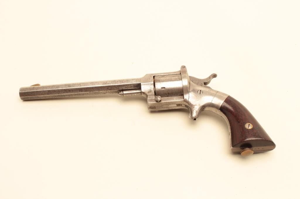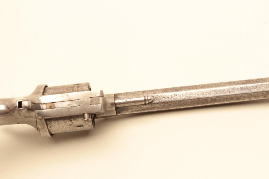 6” octagon barrel, grey patina, wood grips, S/N 4077, in overall good condition with grey patina and scattered pinprick pitting, good action, good bore and very good grips. (Antique). Est.: $250-$500.