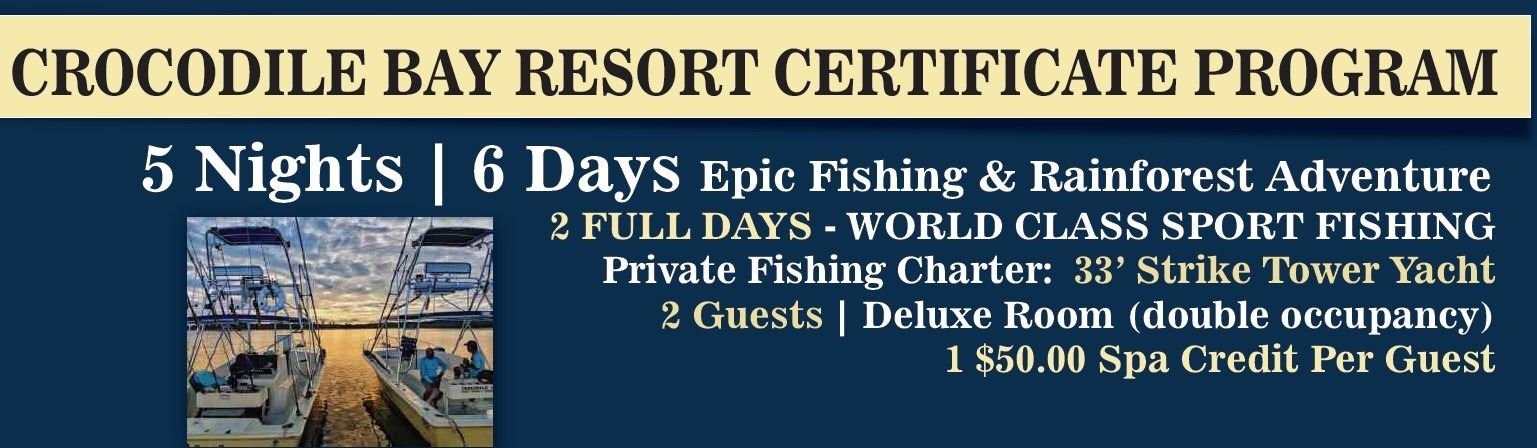 Enjoy 5 beautiful tropical nights at the luxurious CROCODILE BAY & BOTANIKA RESORT on Costa Rica's Osa Peninsula with TWO full days of world-class sport fishing from the legendary CROCODILE BAY MARINA team. Your stay at the Crocodile Bay and Botanika Resort includes luxurious air-conditioned accommodations for two guests (double room occupancy) with two days of inshore or or offshore sport fishing ona 33ft Strike Tower Yacht. Package includes: 5 hotel nights at Crocodile Bay | Botanika Resort, hotel meals & beverage, 2 full days fishing on 33' Strike Tower, Costa Rica Fishing License (2), English speaking guide, bait, gear, and fuel, on-board cooler with picnic-style lunch, cold beer, water, and other non-alcoholic beverages. Not included: transportation to/from Crocodile Bay | Botanika Resort, gratuities, and alcohol. Valid on stays prior to October 31, 2022. (Blackout dates: Feb 1 - March 31). Contact: Lisa@lynchcreektravel.com, 1-800-733-1115 x 1003